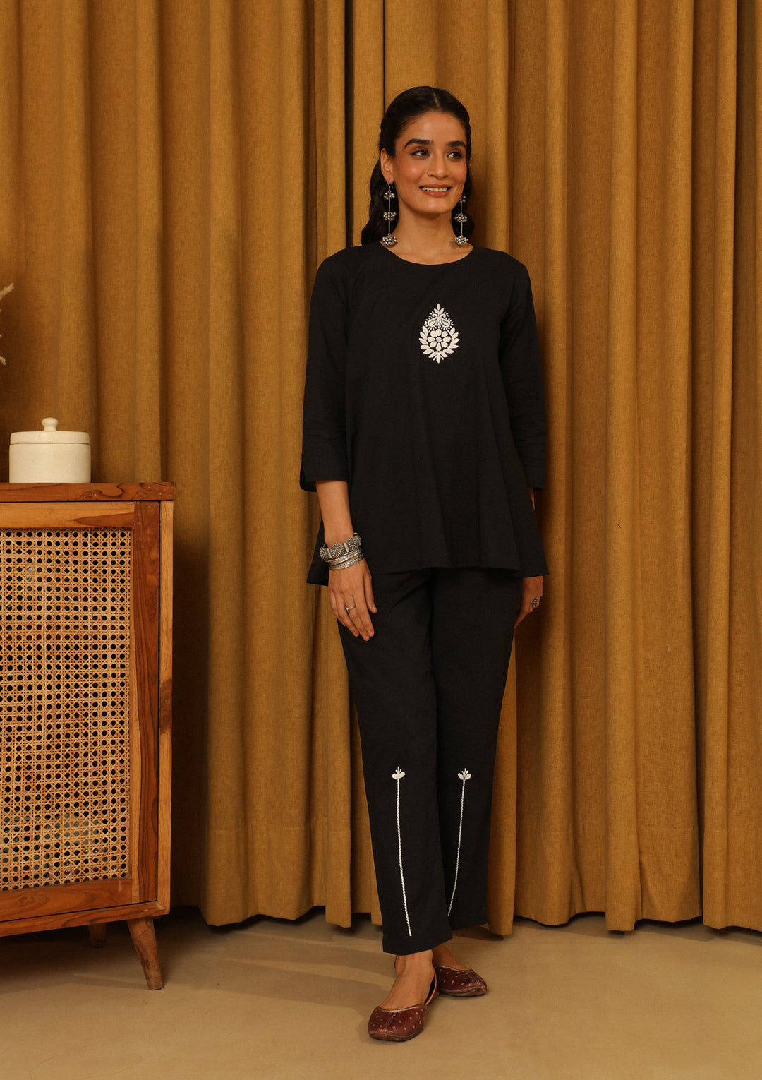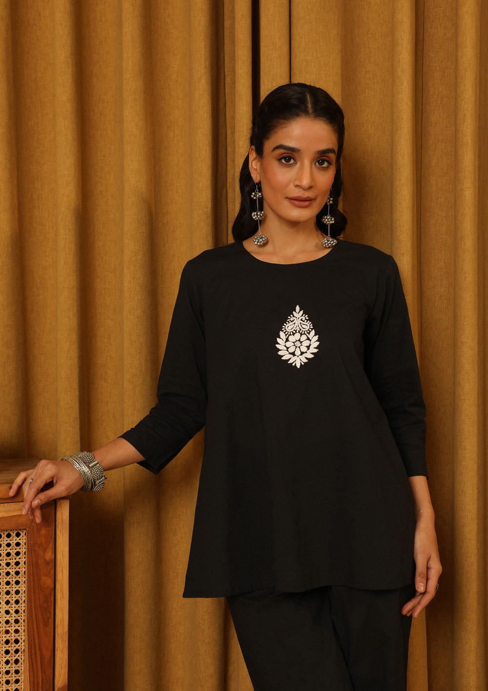 HOC Cotton Chikankari Printed Women's Long Kurta - Black
