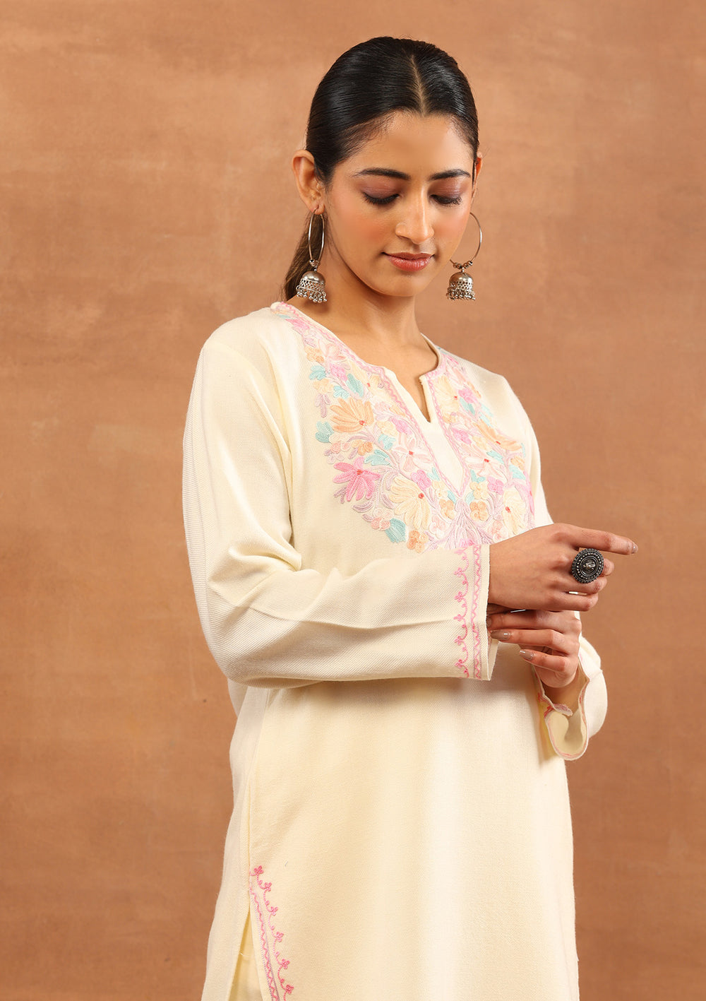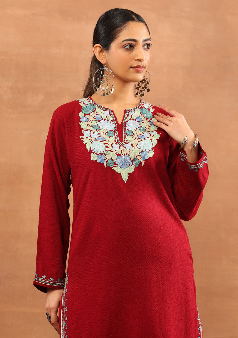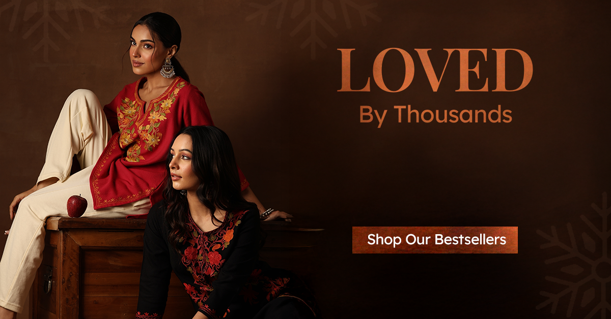 With the winter season approaching, Kashmiri embroidered kurtis and kurta sets are all you need to elevate your winter wardrobe. The beautiful motifs of aari embroidery and the rich colour palette of our Kashmiri dresses can be worn on any special occasion.