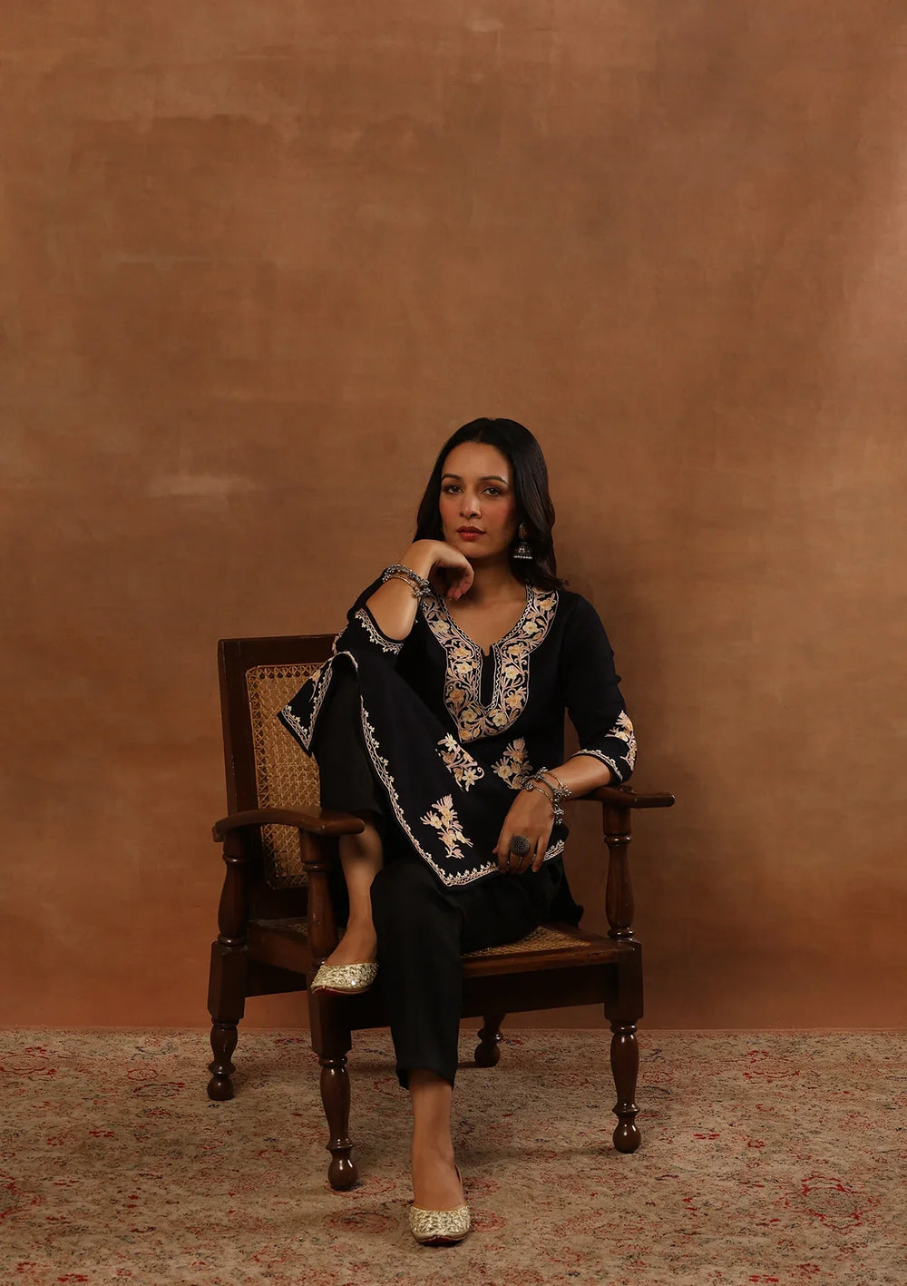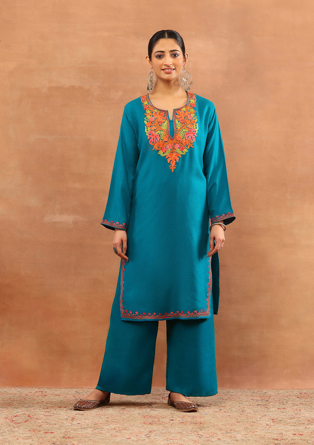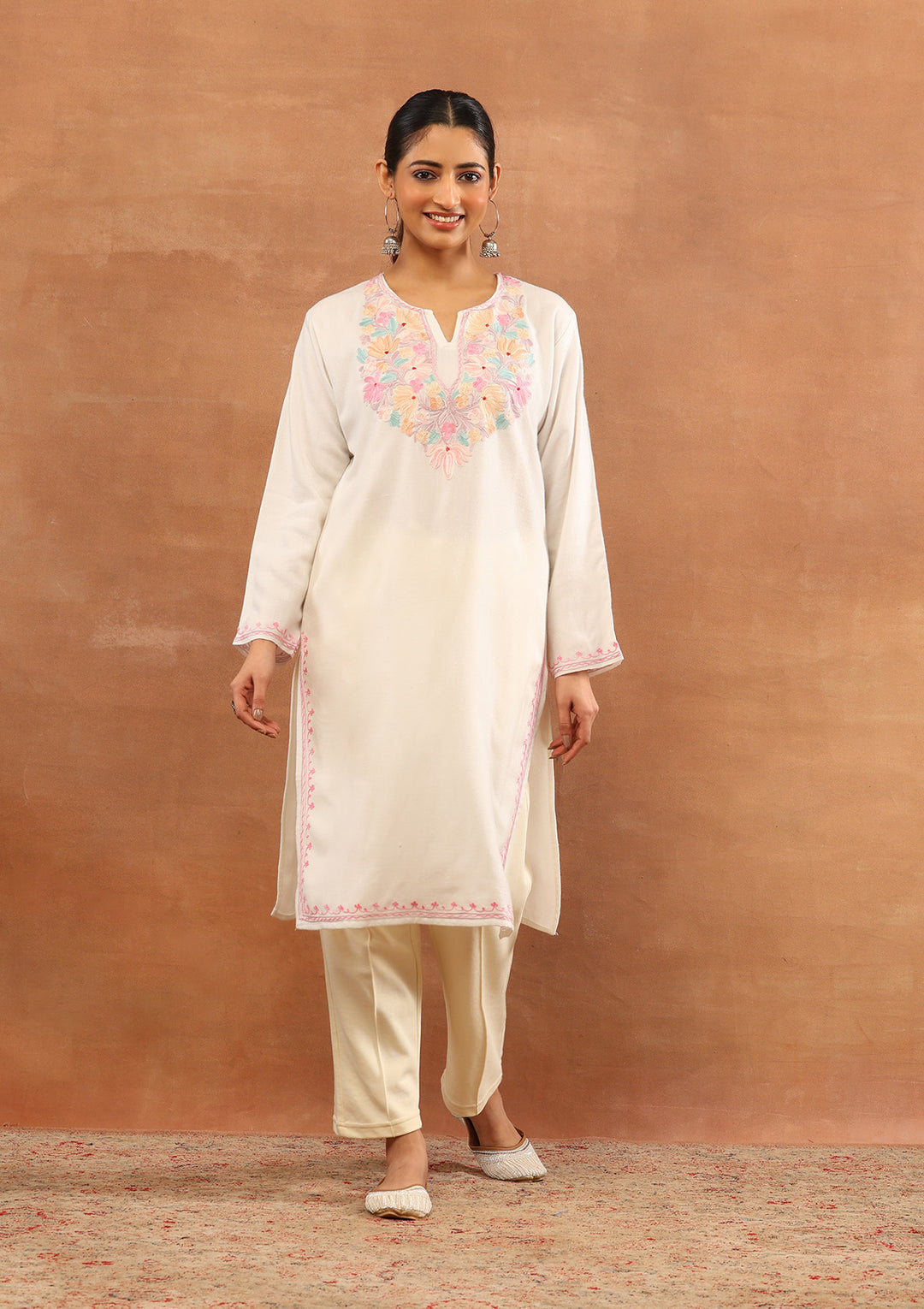 With the winter season approaching, Kashmiri embroidered kurtis and kurta sets are all you need to elevate your winter wardrobe. The beautiful motifs of aari embroidery and the rich colour palette of our Kashmiri dresses can be worn on any special occasion.