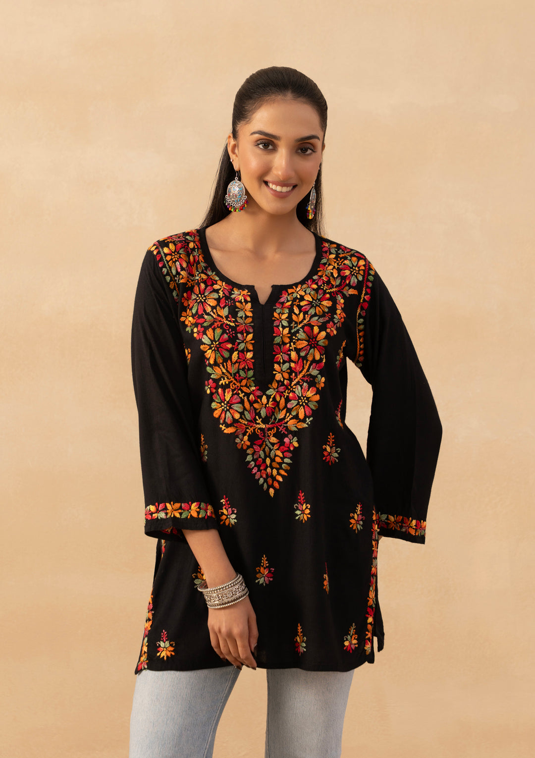 With the winter season approaching, Kashmiri embroidered kurtis and kurta sets are all you need to elevate your winter wardrobe. The beautiful motifs of aari embroidery and the rich colour palette of our Kashmiri dresses can be worn on any special occasion.