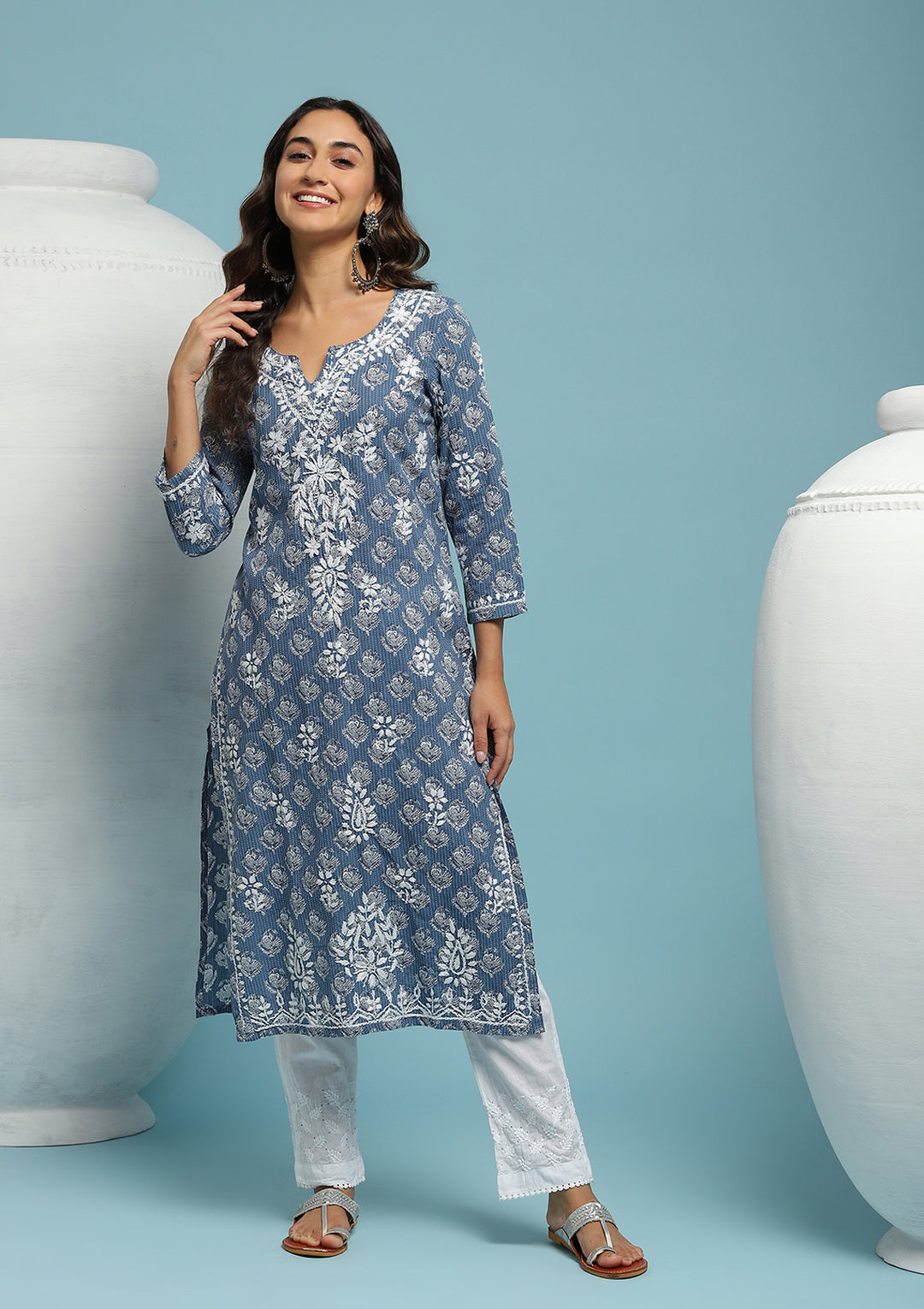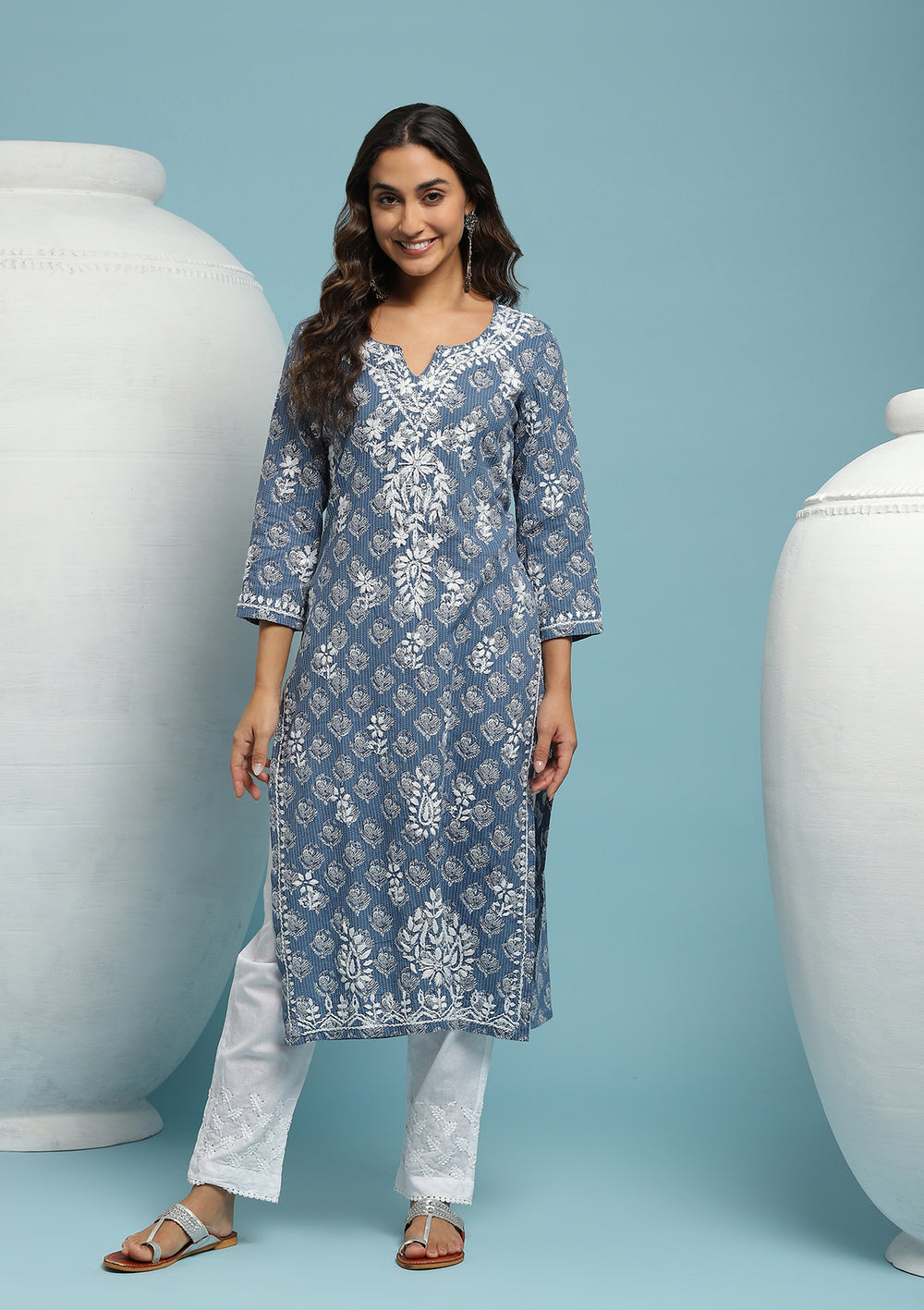 HOC Tamara Mulmul Chikankari Printed Women's Straight Kurta - Navy Blue