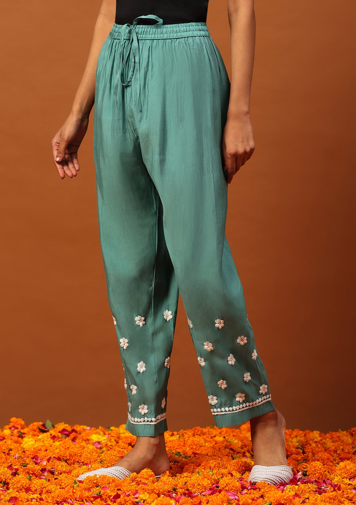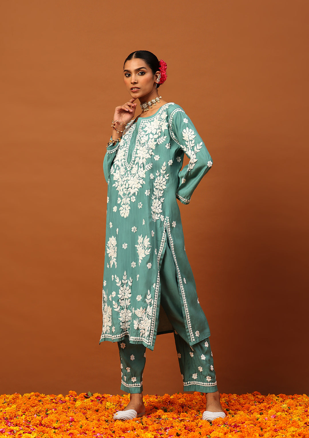 HOC Chanderi Chikankari Solid Women's 2 PC Long Kurta Set -Teal Green