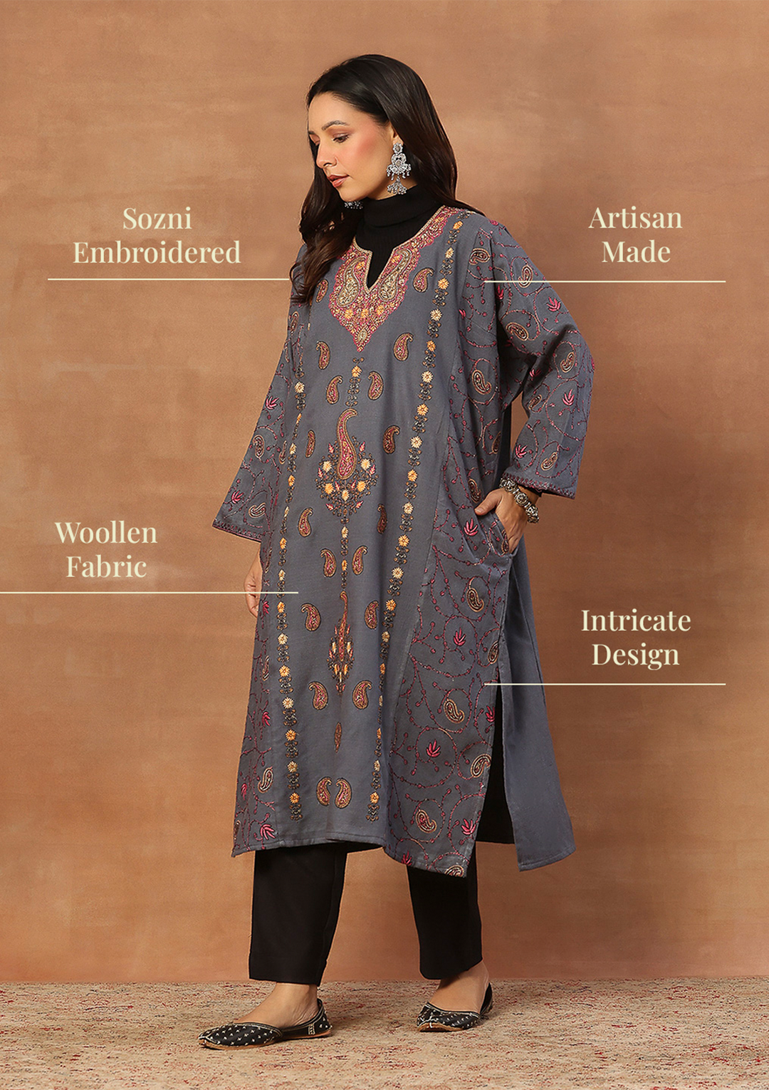 HOC Kashmiri Wool Sozni Solid Women's Long Phiran- Grey