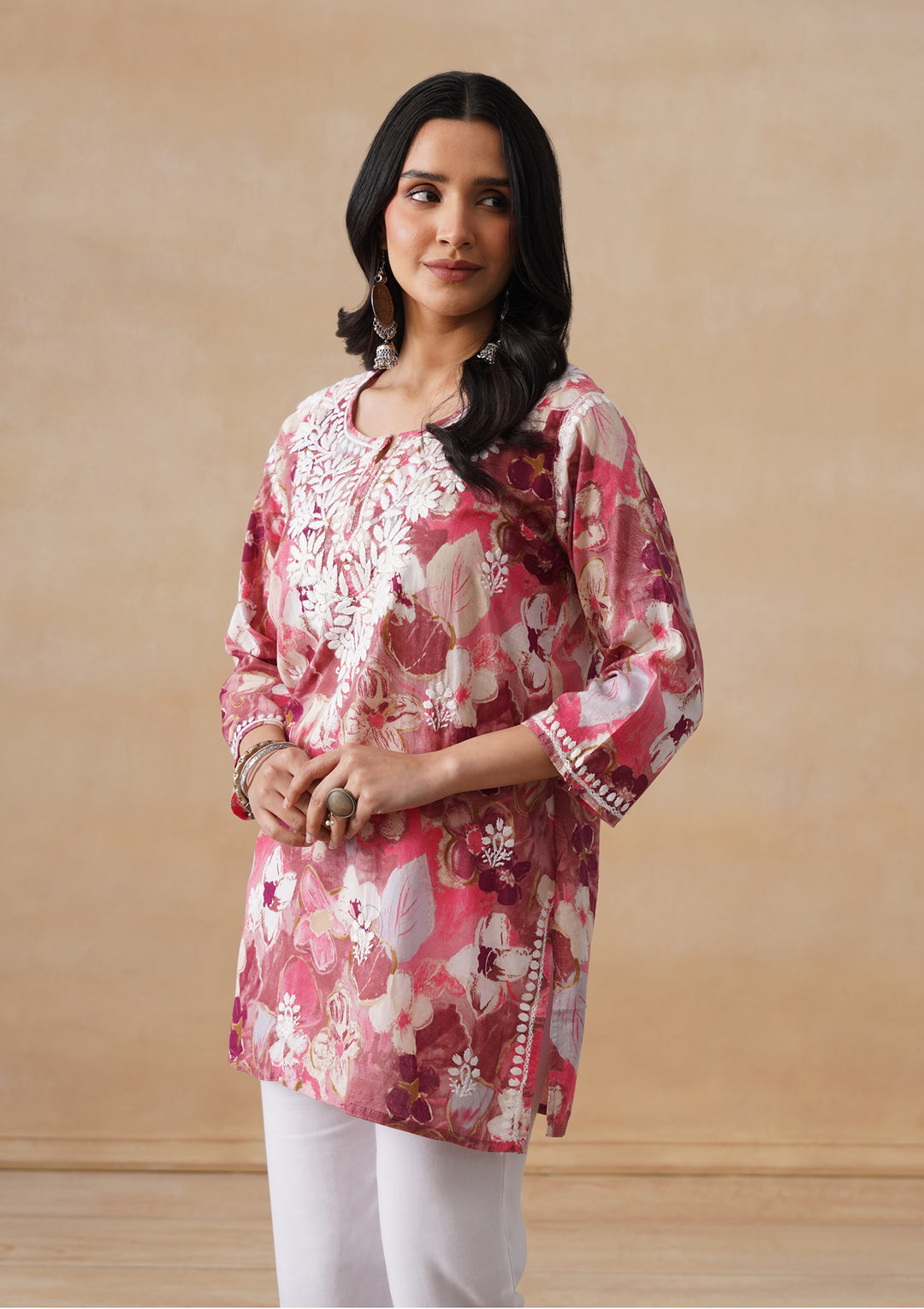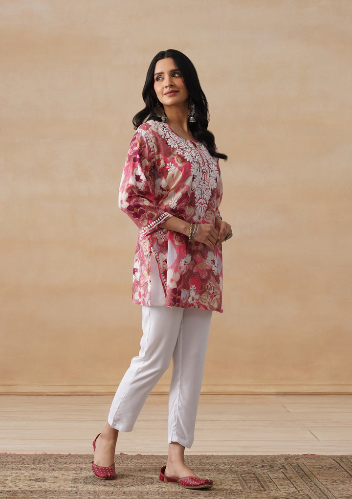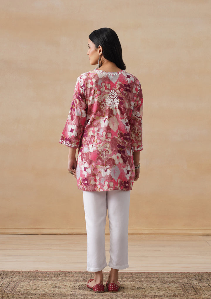 HOC Mulmul Chikankari Printed Women's Short Kurta - Pink