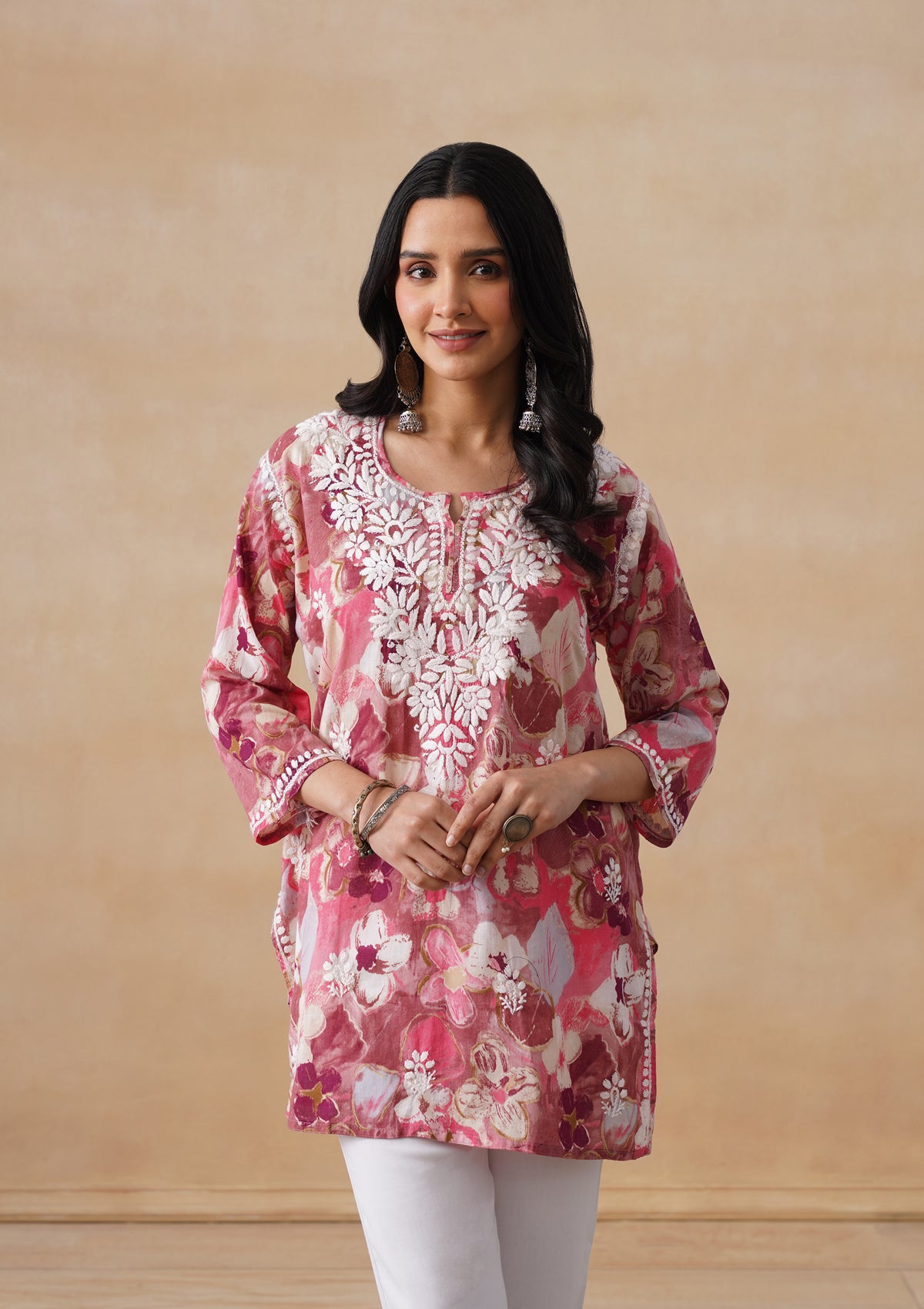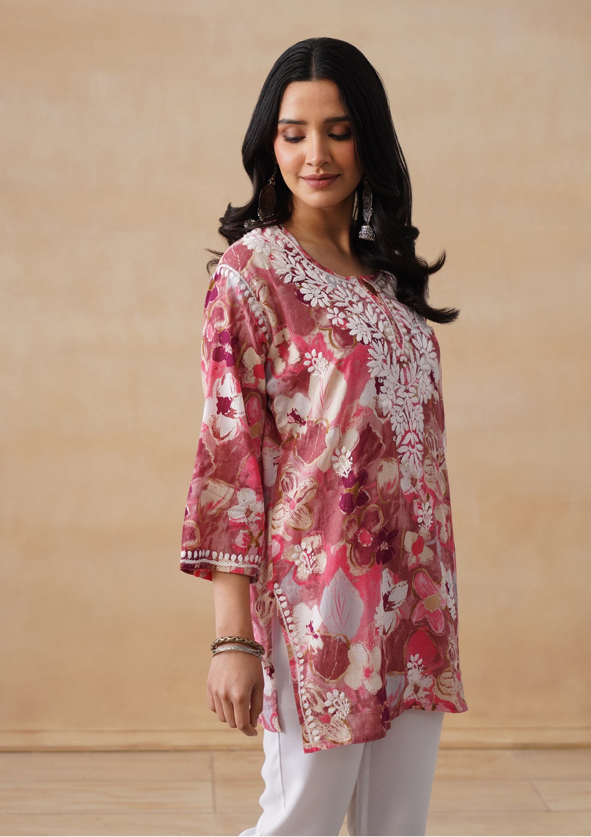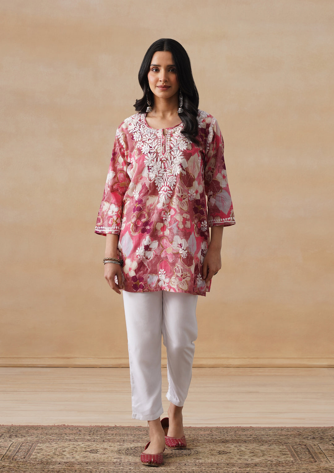 HOC Mulmul Chikankari Printed Women's Short Kurta - Pink