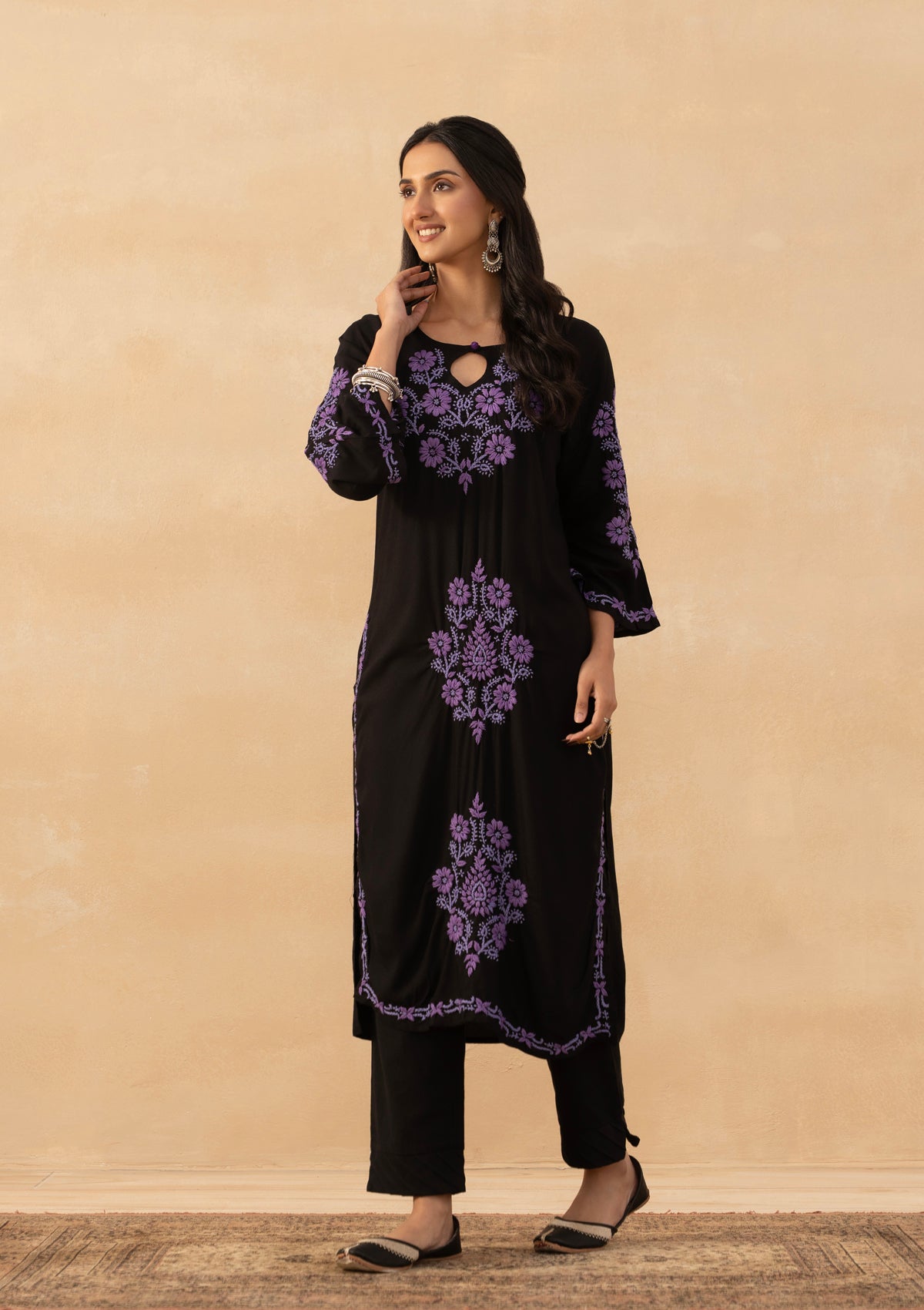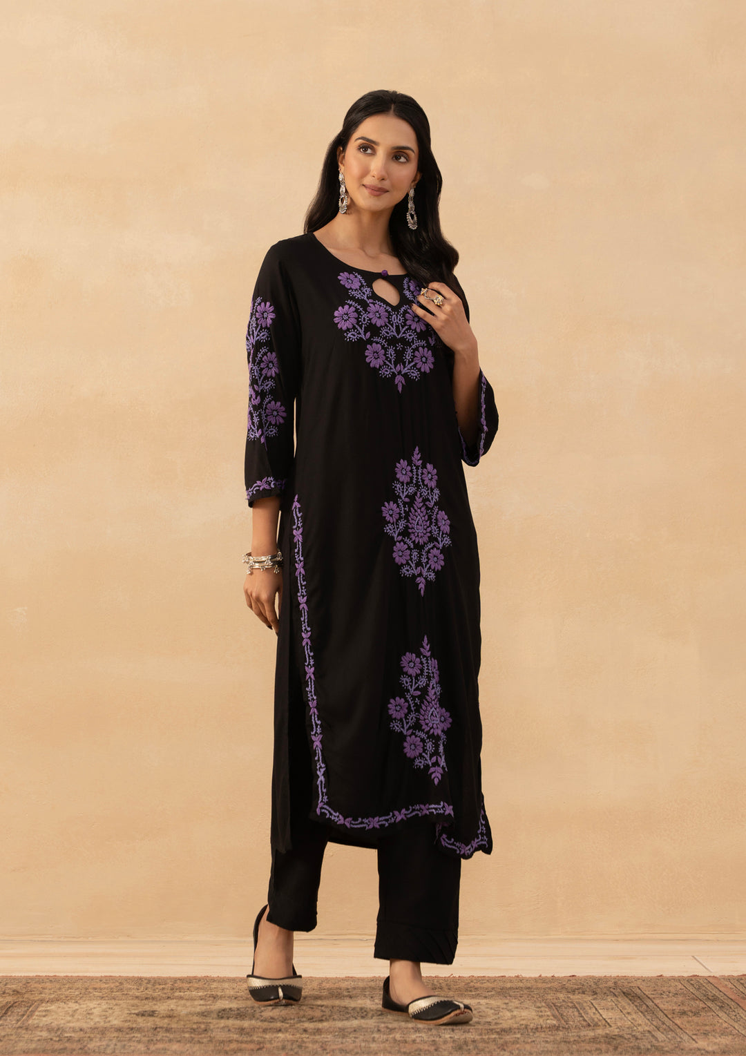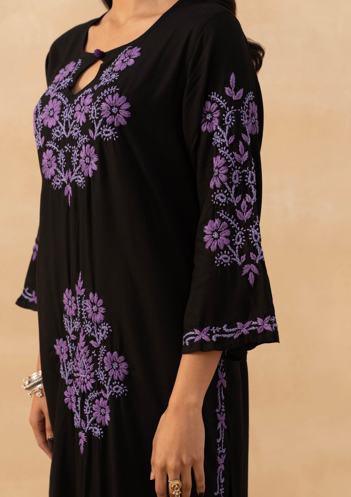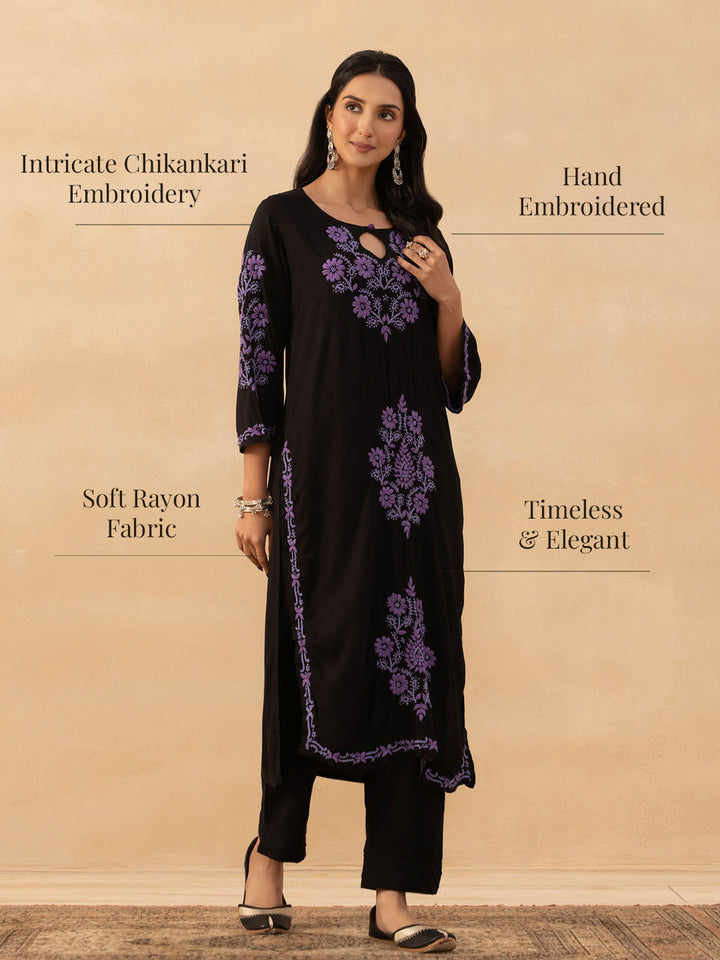 HOC Rayon Chikankari Solid Women's Long Kurta - Black