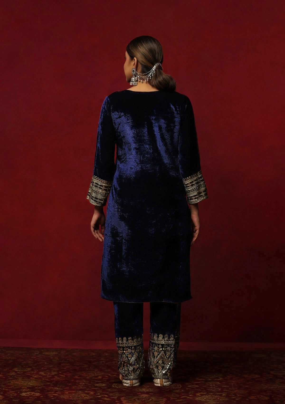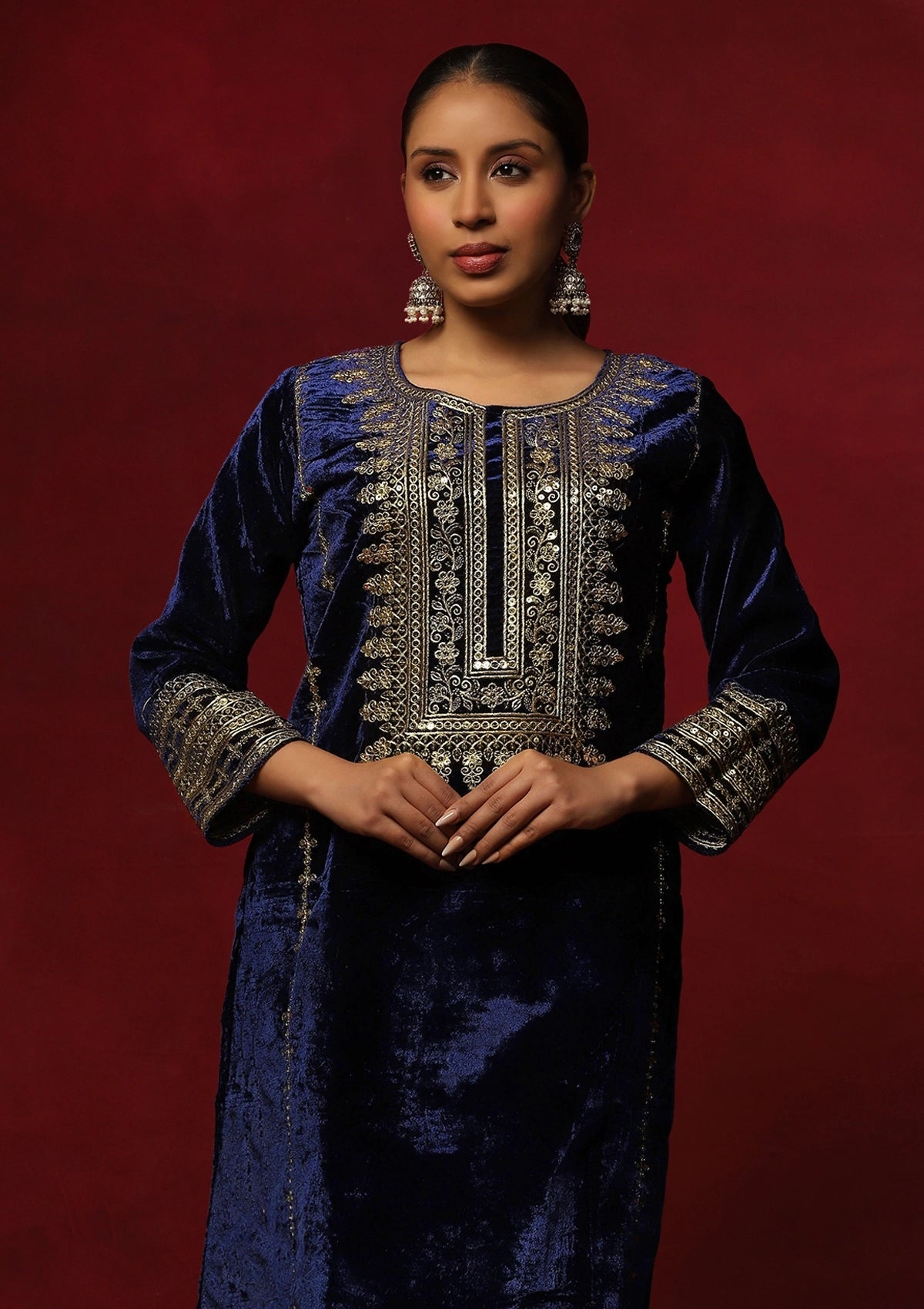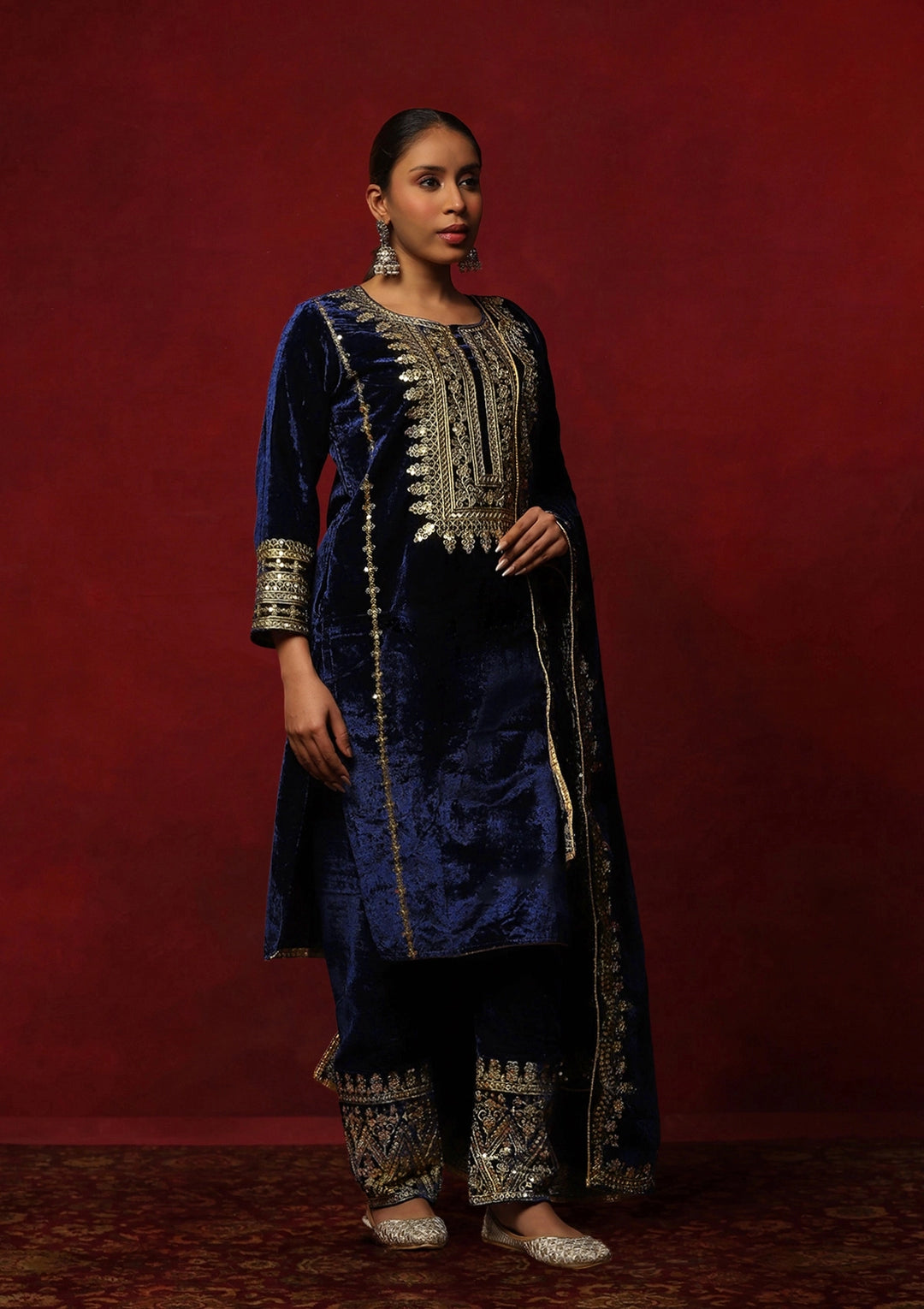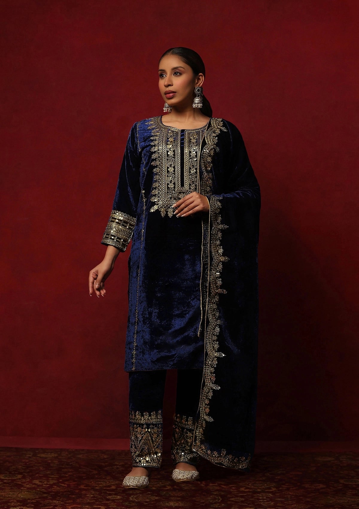 HOC Velvet Zari & Sequin Solid Women's 3 Pc Long Kurta Set-Navy Blue
