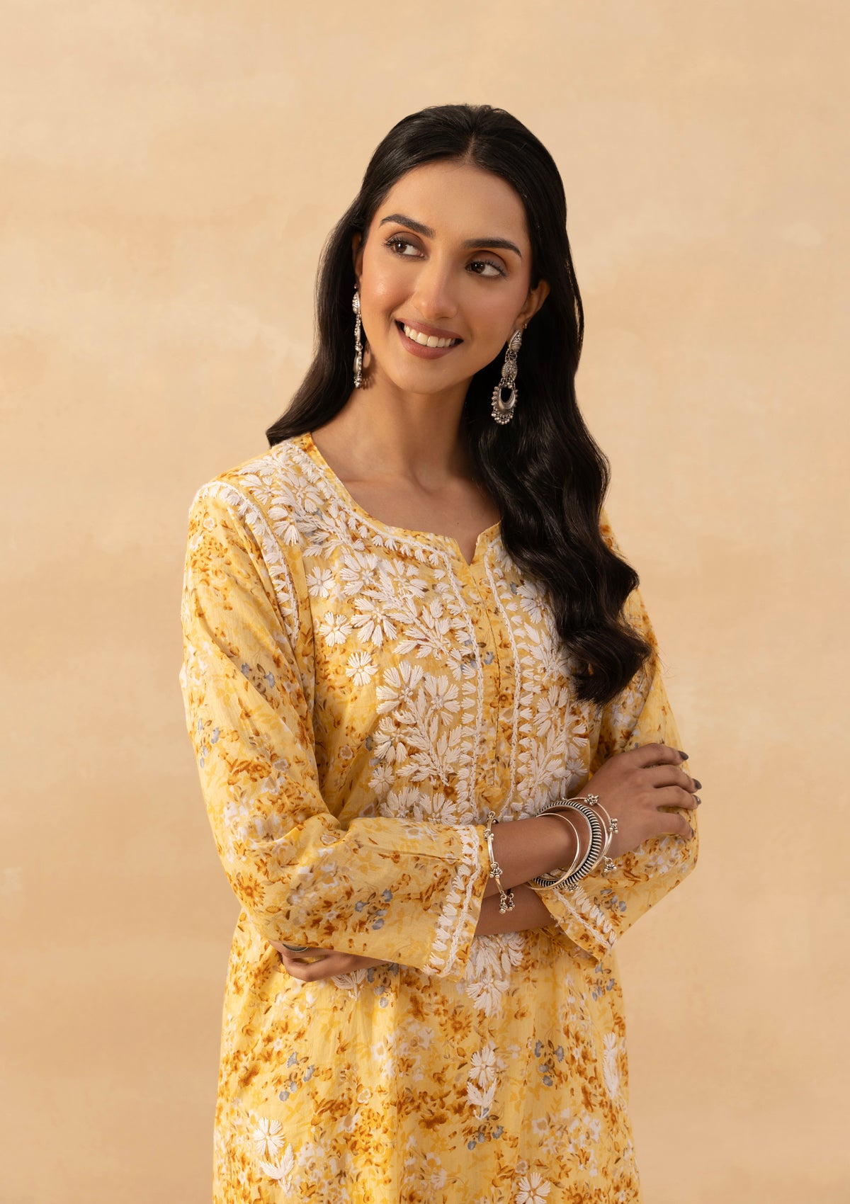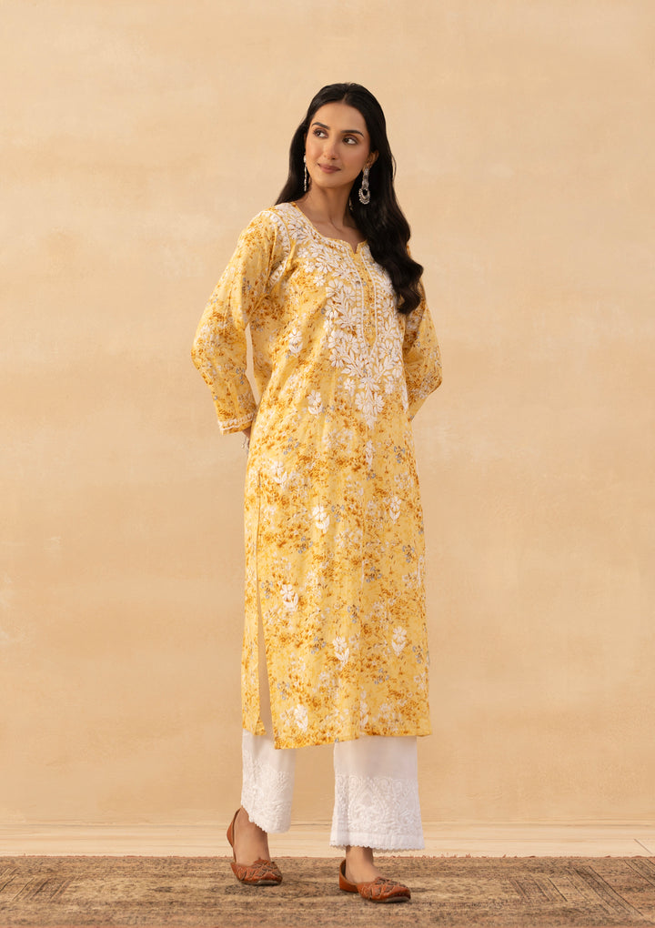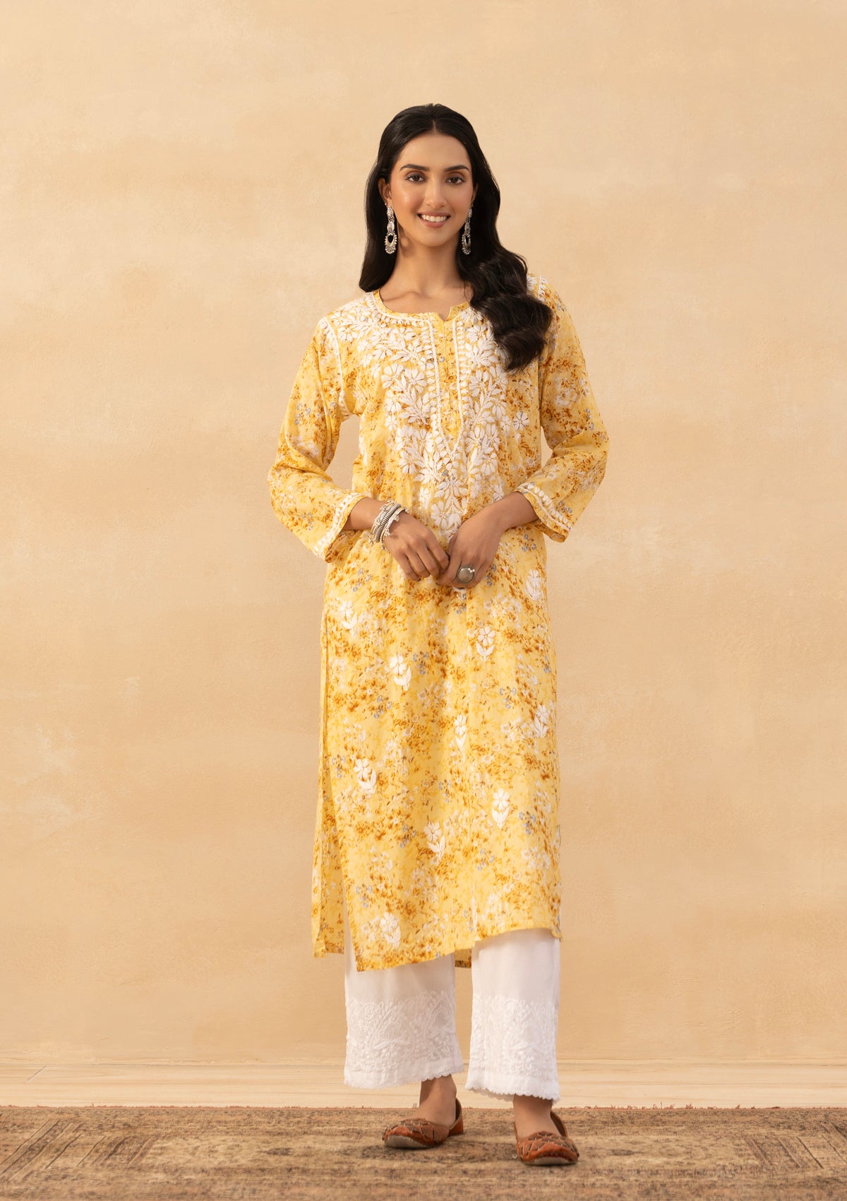 HOC Mulmul Chikankari Printed Women's Long Kurta - Yellow