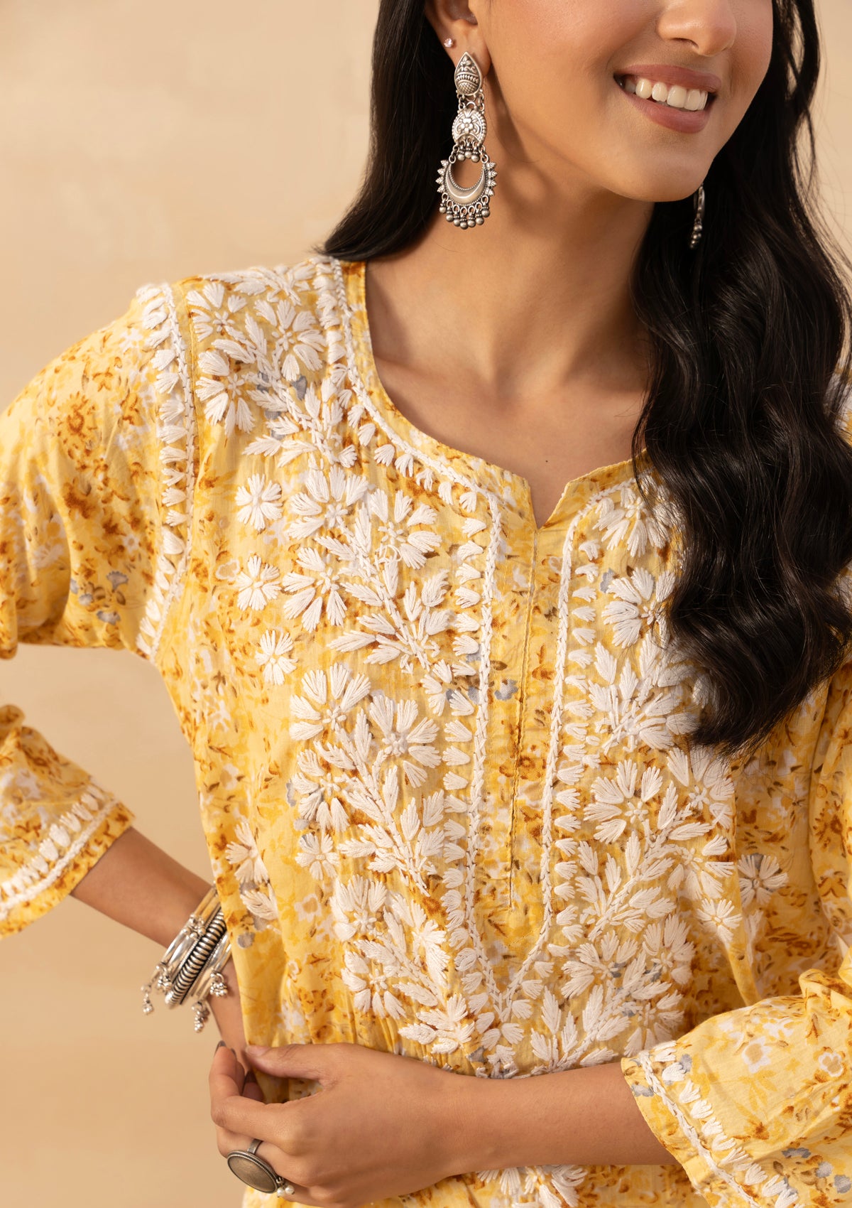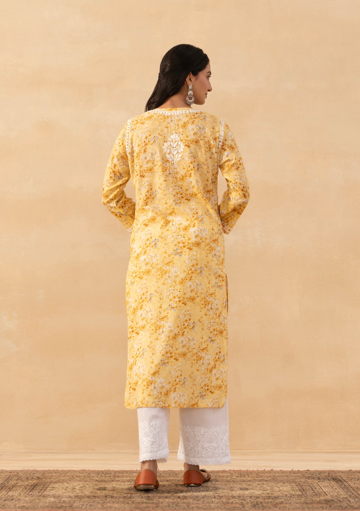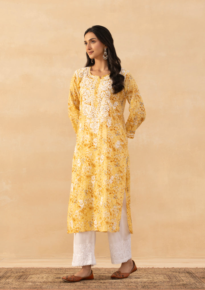 HOC Mulmul Chikankari Printed Women's Long Kurta - Yellow