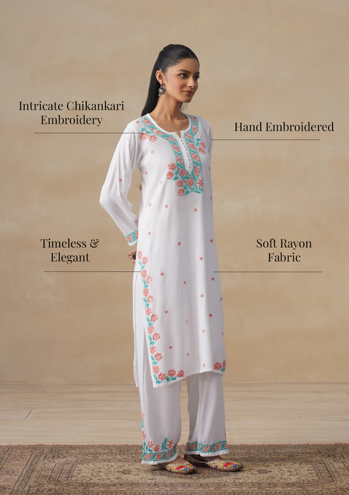 HOC Rayon Chikankari Solid Women's Long Kurta Set - White