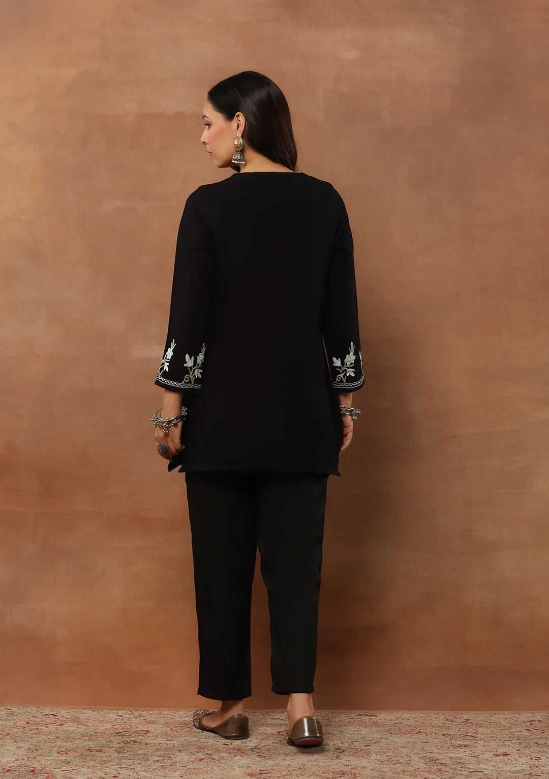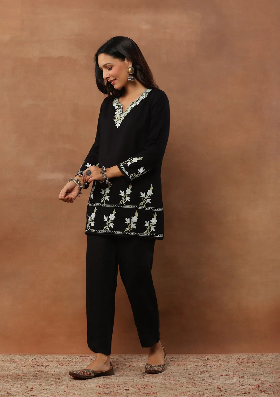 HOC Wool Aari Embroidered Solid Women's Short Kurta - Black