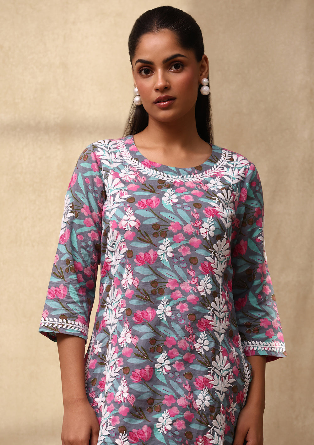 HOC Cotton Chikankari Printed Women's 2 PC Co-ord Set - Grey