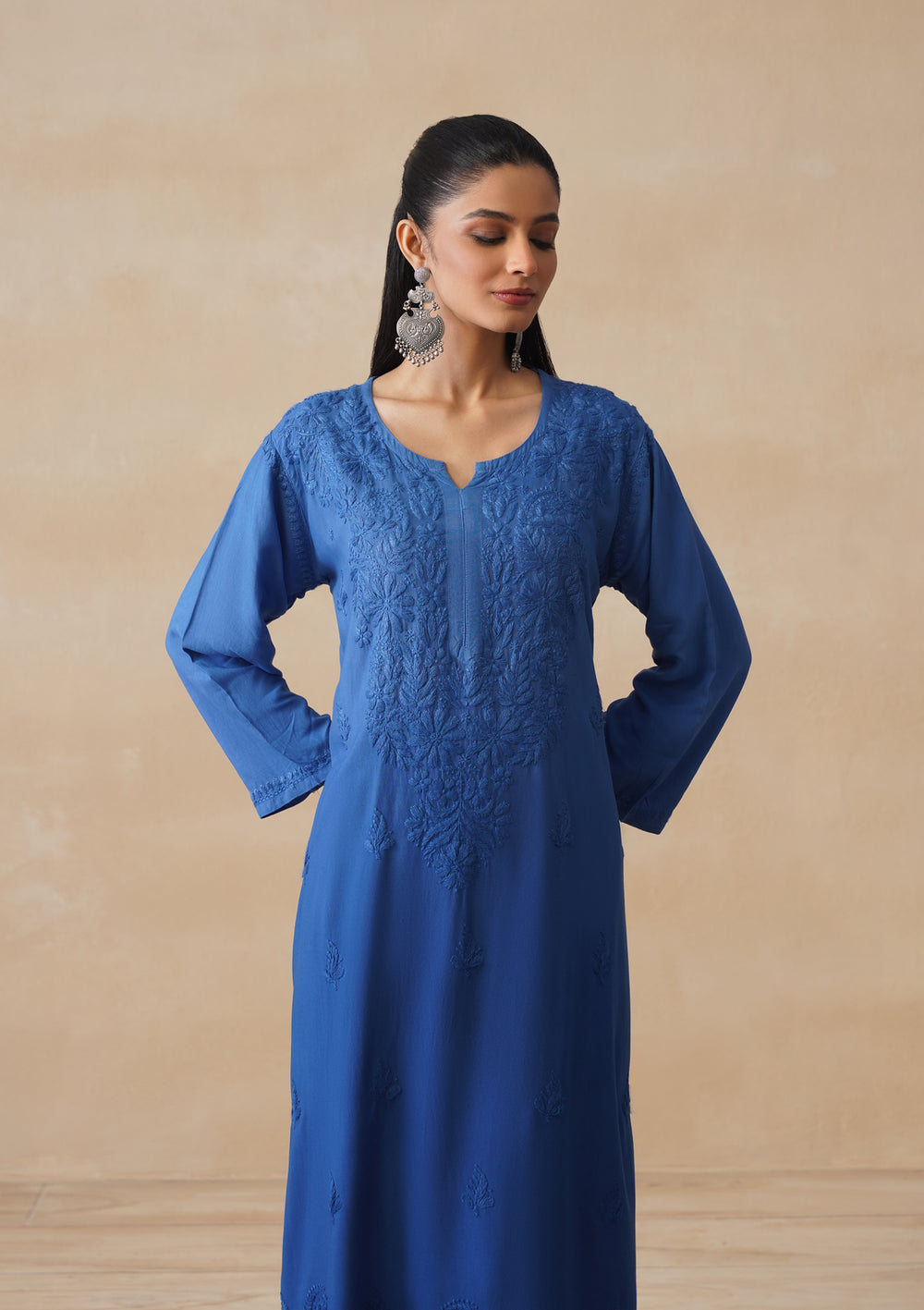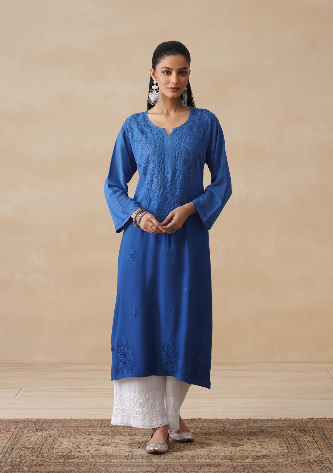 HOC Rayon Chikankari Solid Women's Long Kurta - Electric blue
