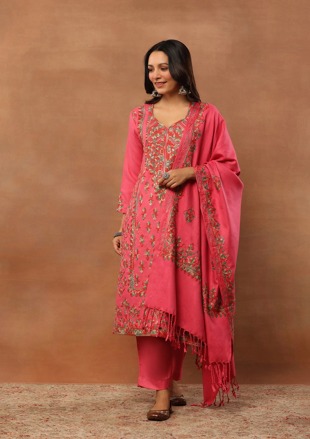 HOC Aari Embroidered Woollen Solid Women's Long Kurta - Royal Blue