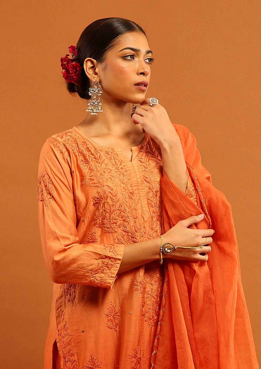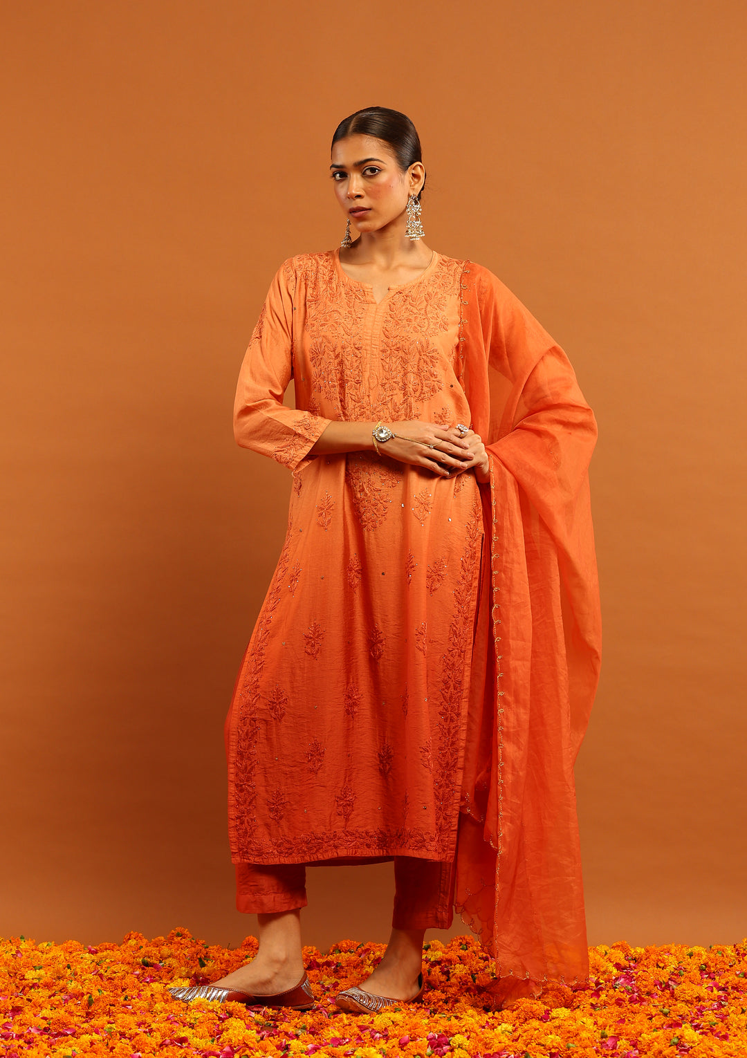 Karisma Chanderi Chikankari Mukaish With Kamdani Work Solid Women's 3 PC Long Kurta Set - Orange