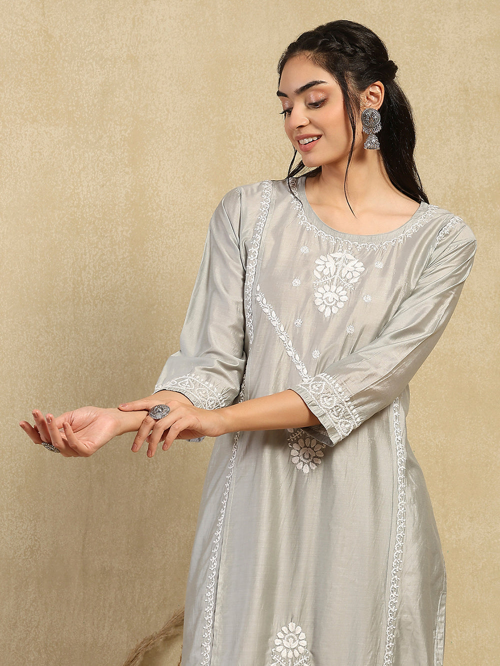 HOC Chanderi Chikankari Solid Women's 2PC Long Kurta Set -Grey