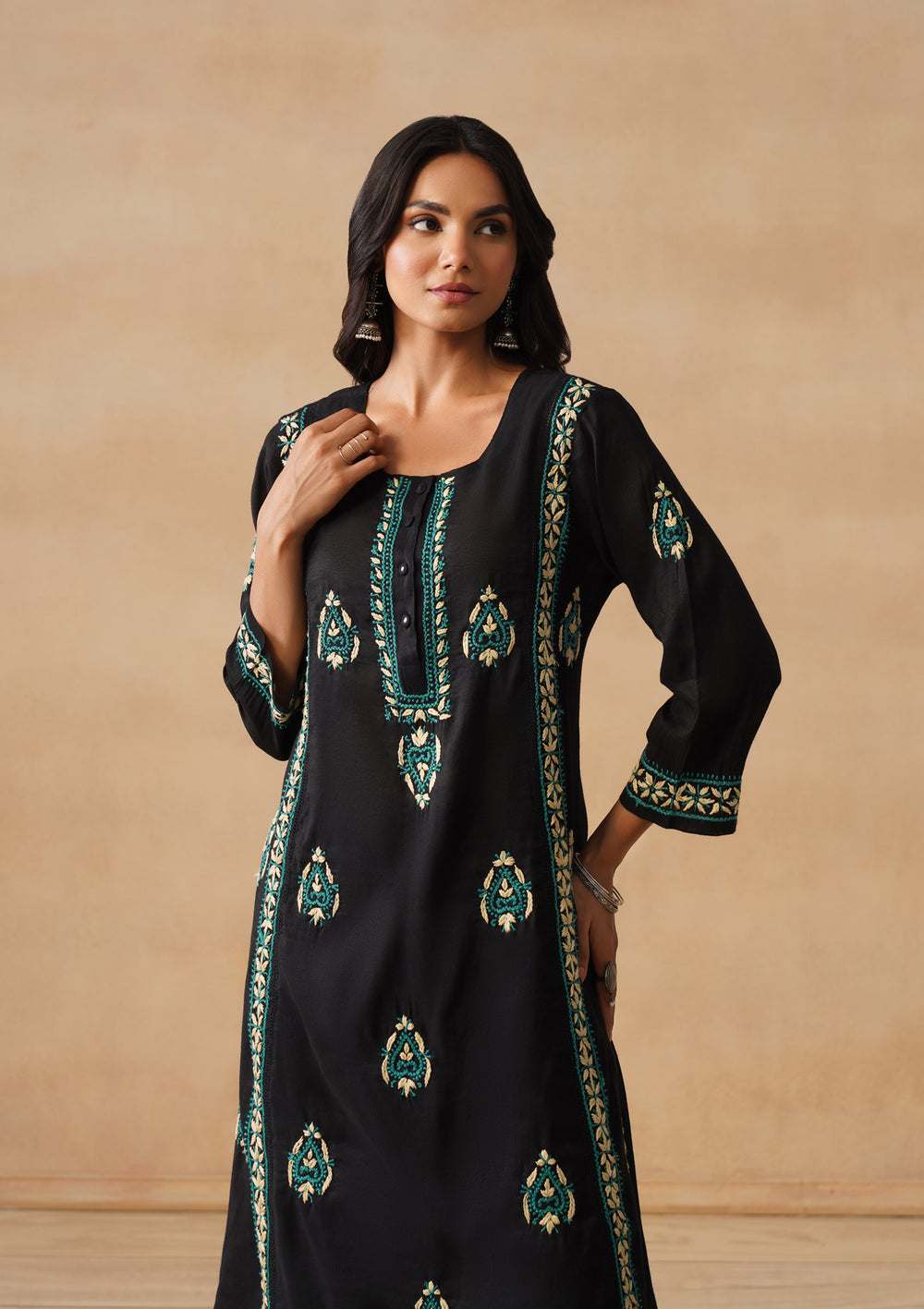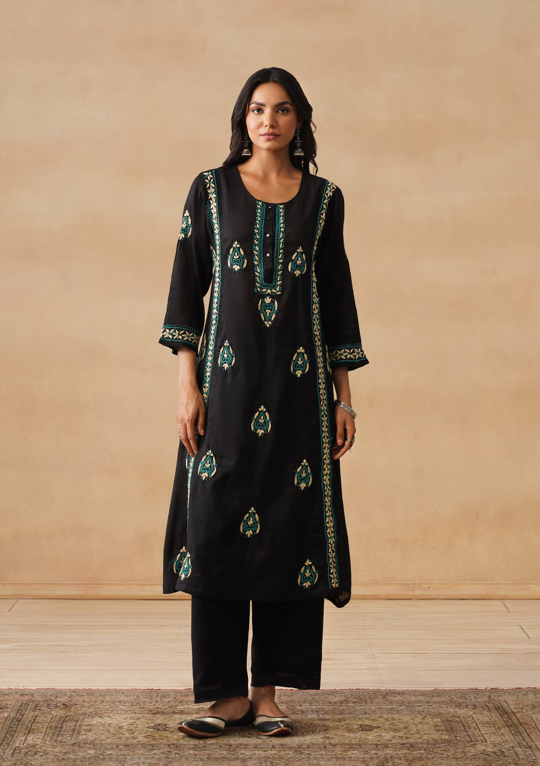HOC Chanderi Chikankari Solid A-Line Women's Long Kurta Set-Black