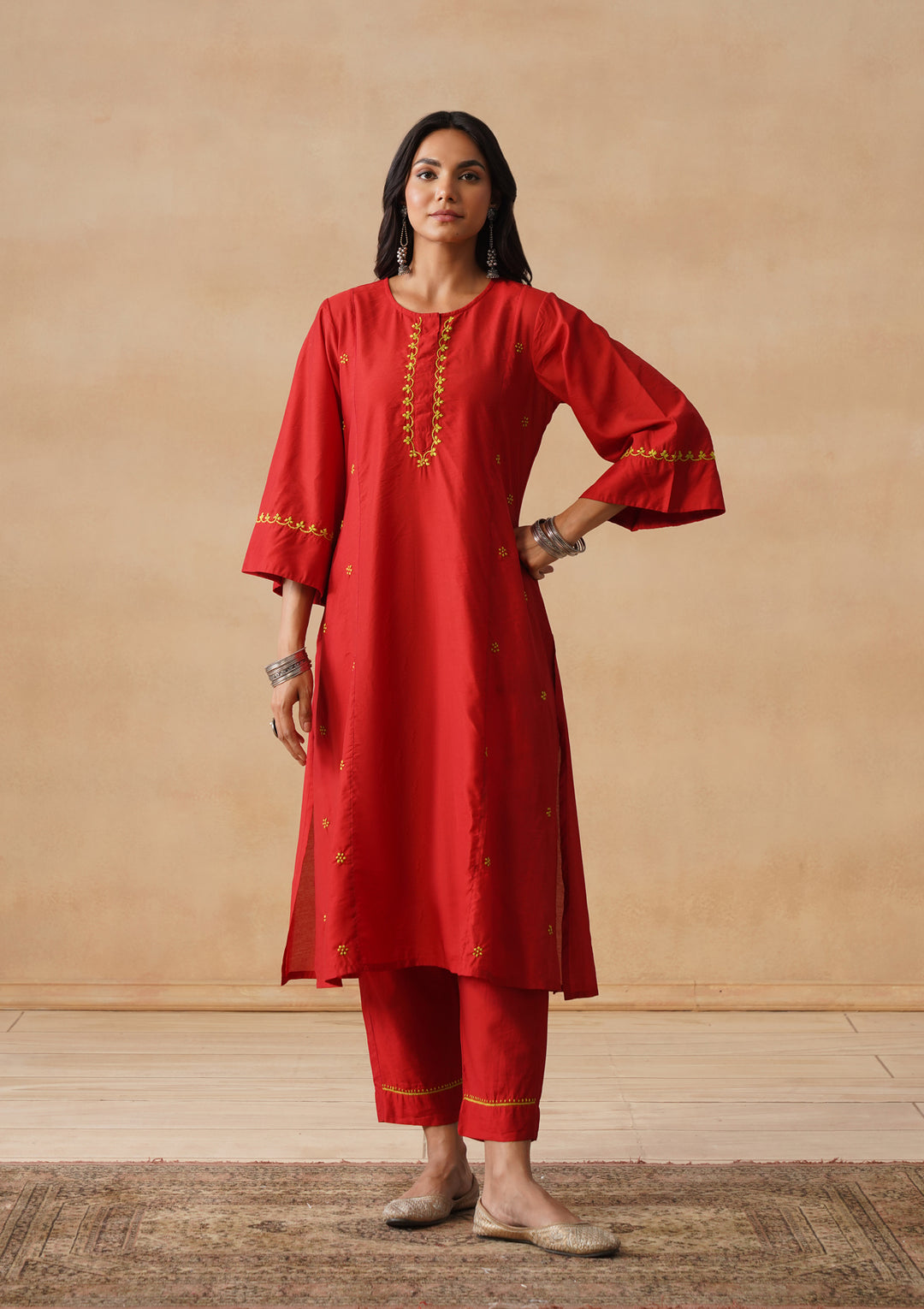 HOC Chanderi Chikankari Solid Women's 3 PC Long Kurta Set-Red