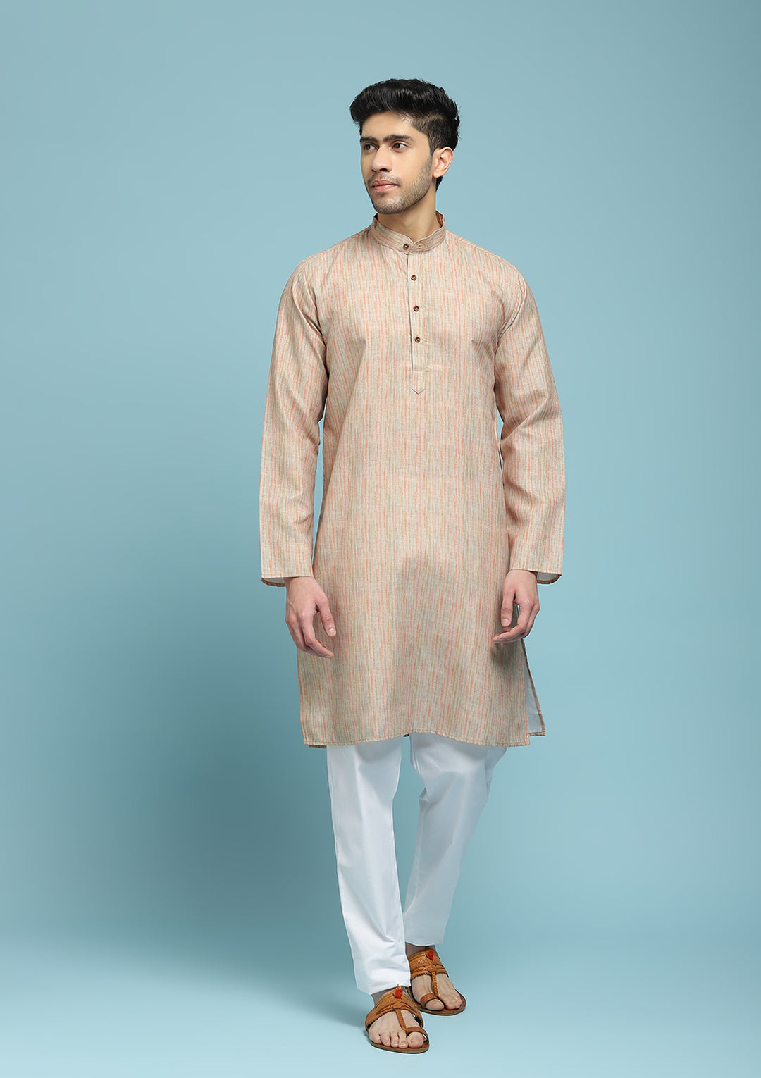 If you are in search for a piece that has sleek cut and classic design, then our Faisal Cotton Straight Men is all you need to amp up your wardrobe. This beige kurta for men is all about class and timeless elegance.