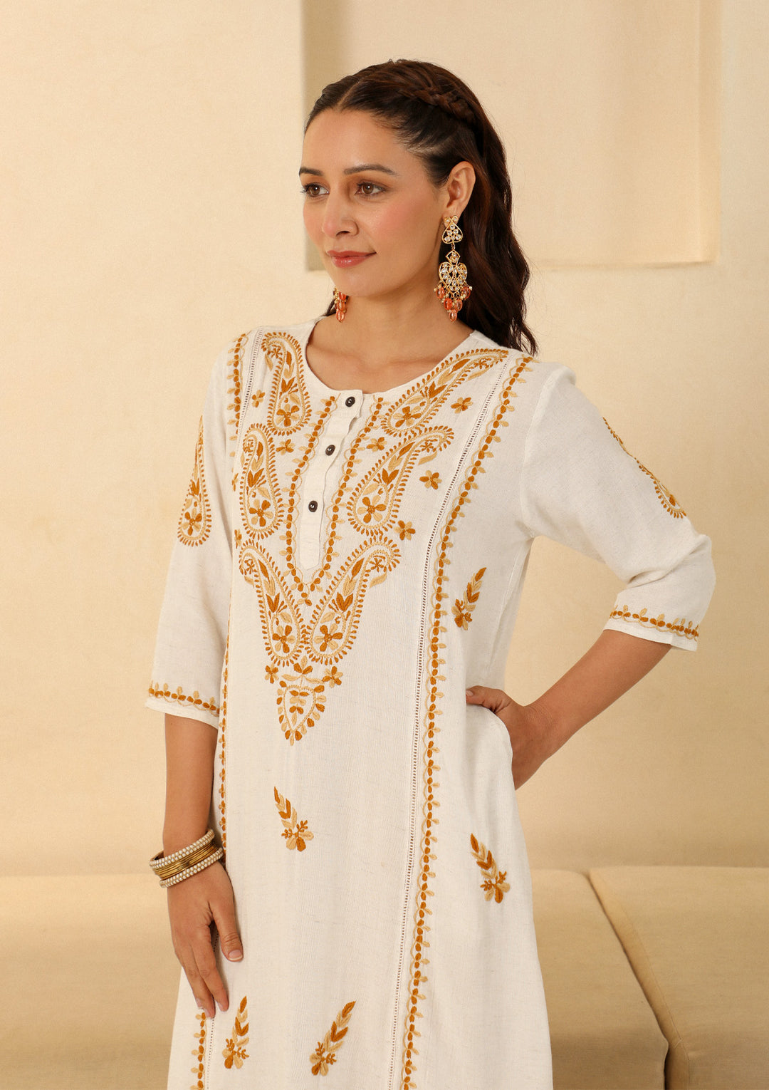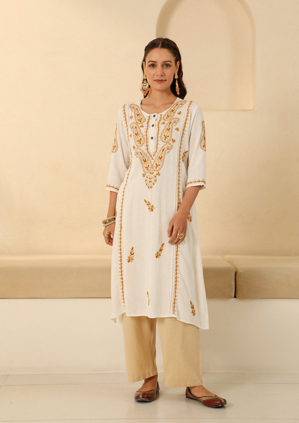 With the winter season approaching, it’s time to upgrade your wardrobe with some subtle colors and nothing beats the charm of a beige color kurta set for women. Our Aari Embroidered Woollen Straight Biege Kurta Set For Women is made with the softest woollen to keep you warm on cold winter days and the ravishing Aari embroidery counts for an exquisite addition to your wardrobe.