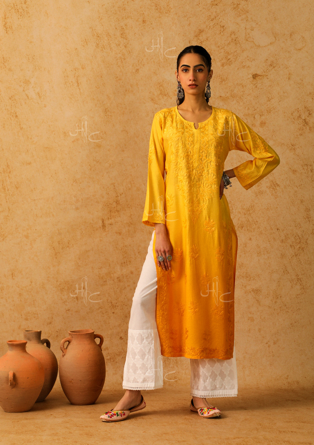 HOC Mira Chikankari Cotton Straight Kurta - Yellow