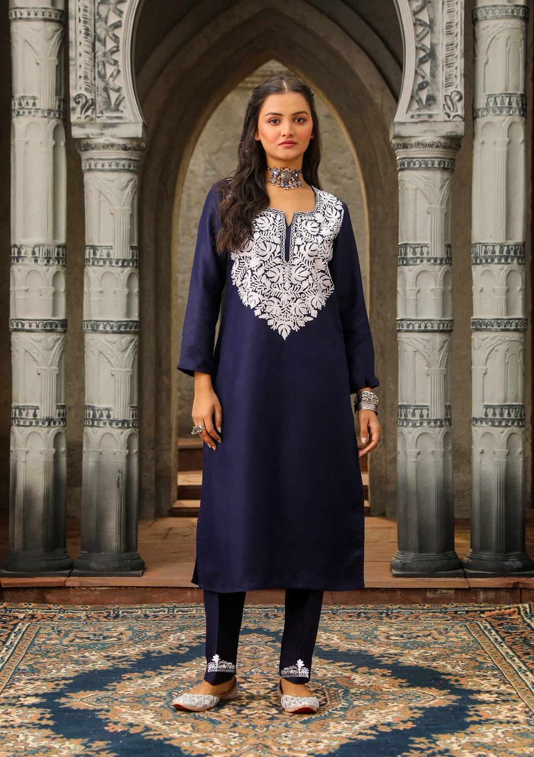 HOC Rayon Chikankari Solid Women's Long Kurta -Navy Blue