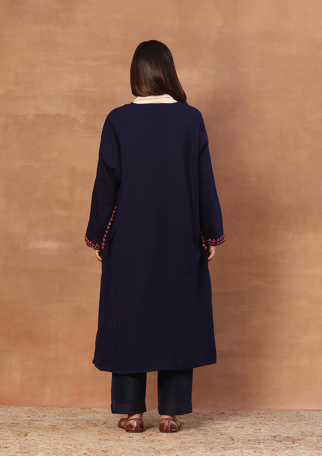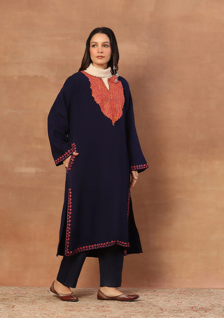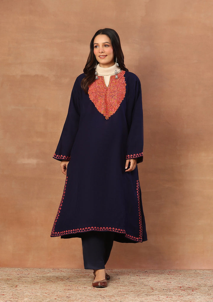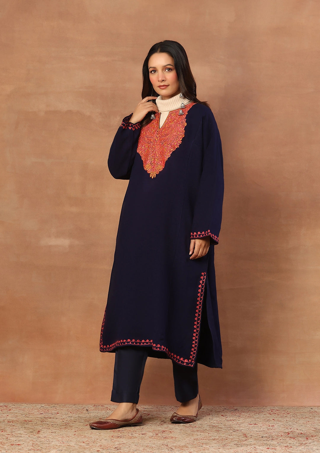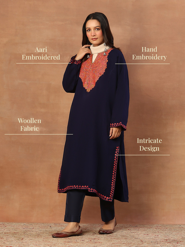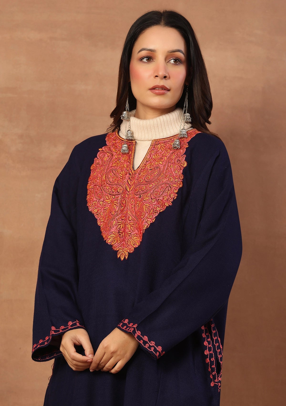 HOC Kashmiri Wool Sozni Solid Women's Long Phiran- Navy Blue