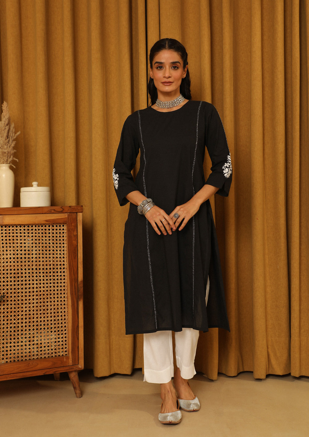 HOC Cotton Chikankari Printed Women's Long Kurta - Black