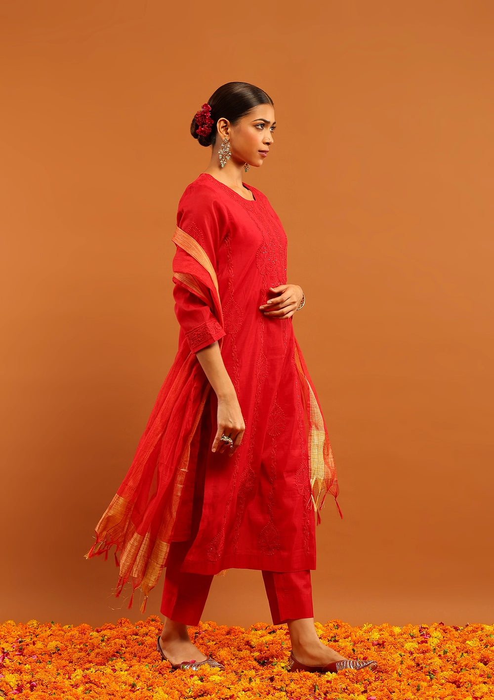 HOC Chanderi Chikankari Solid Women's 3 PC Long Kurta Set-Red