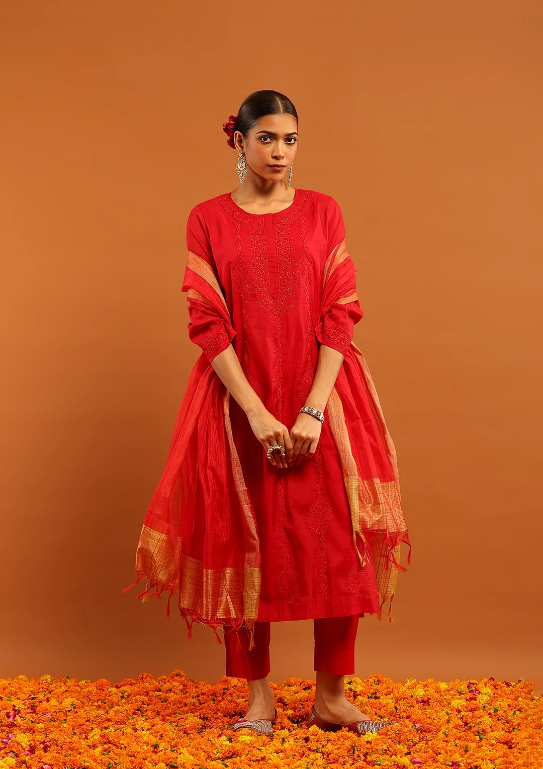 HOC Chanderi Chikankari Gota Work Solid Women's 4 PC Long Kurta Set-Red