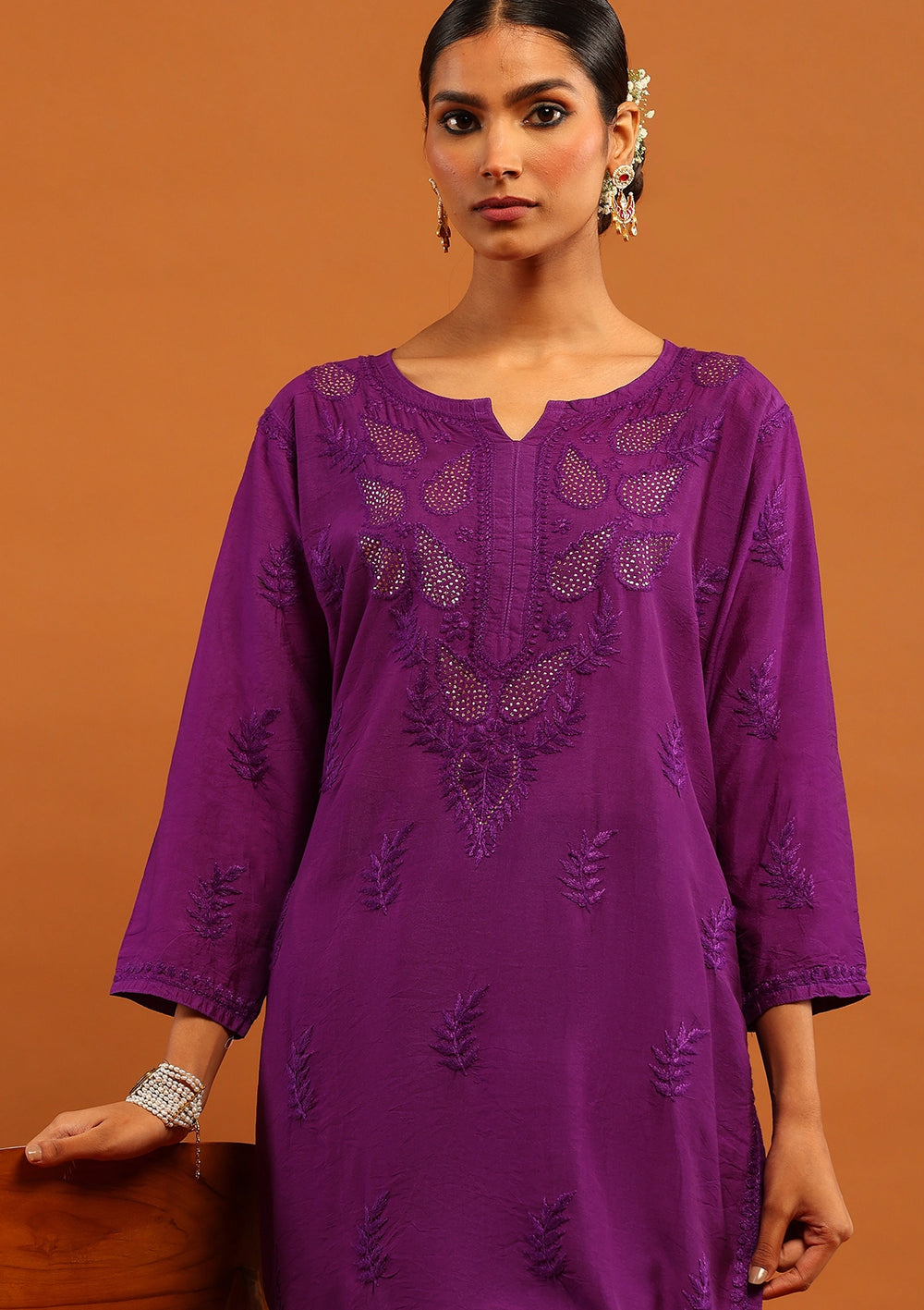 HOC Banarasi Chanderi Chikankari Solid Women's Long Kurta-Purple