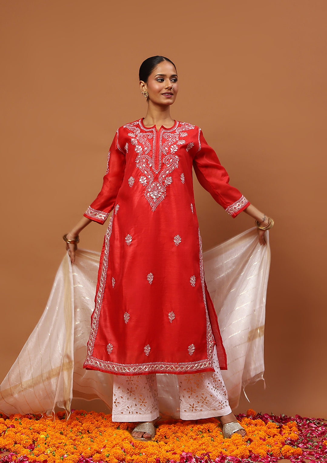 Karisma Chanderi Chikankari Solid Women's 4 PC Long Kurta Set with dupatta - Red