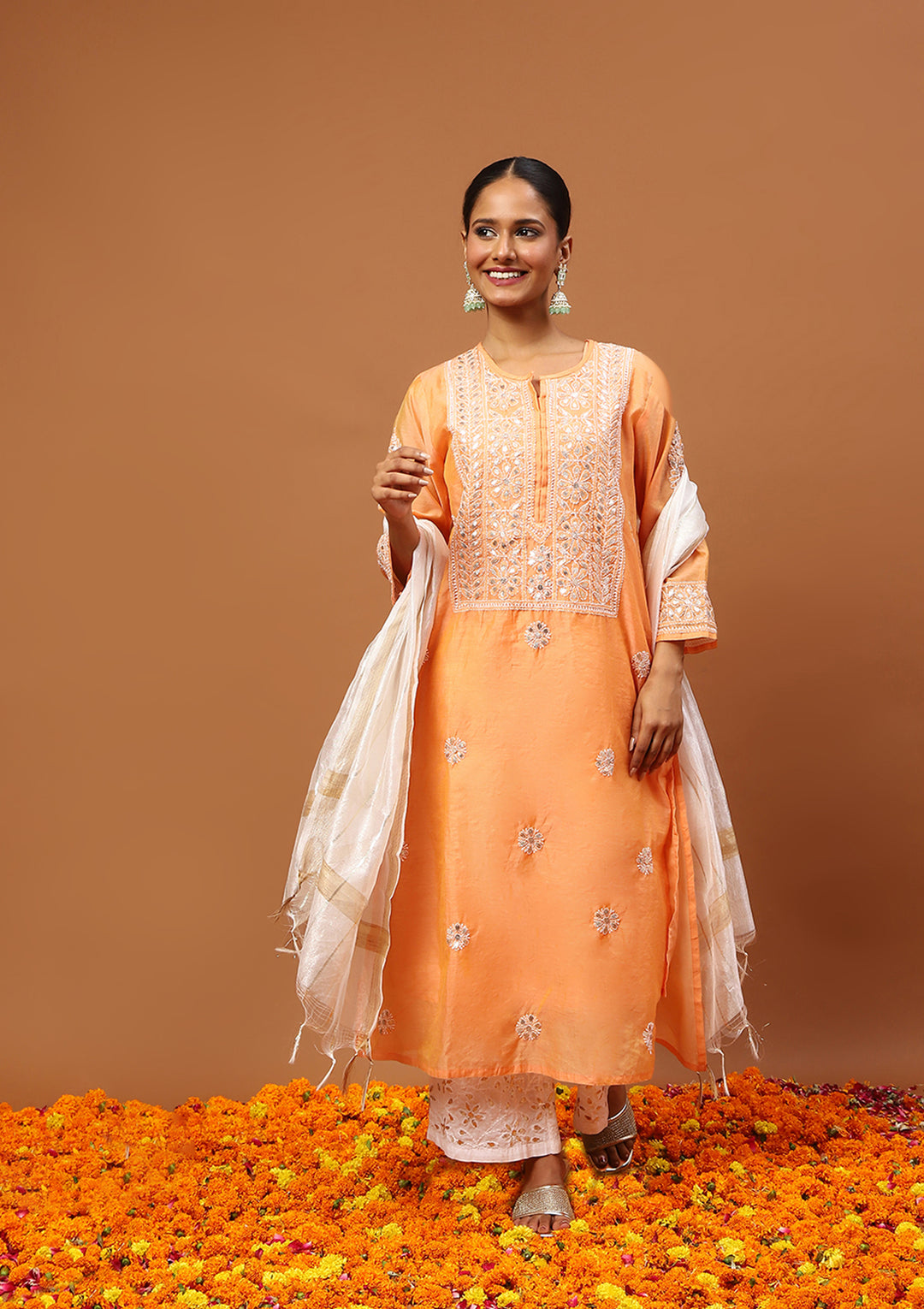 HOC Chanderi Chikankari Gota Work Solid Women's 4 PC Long Kurta Set-Orange