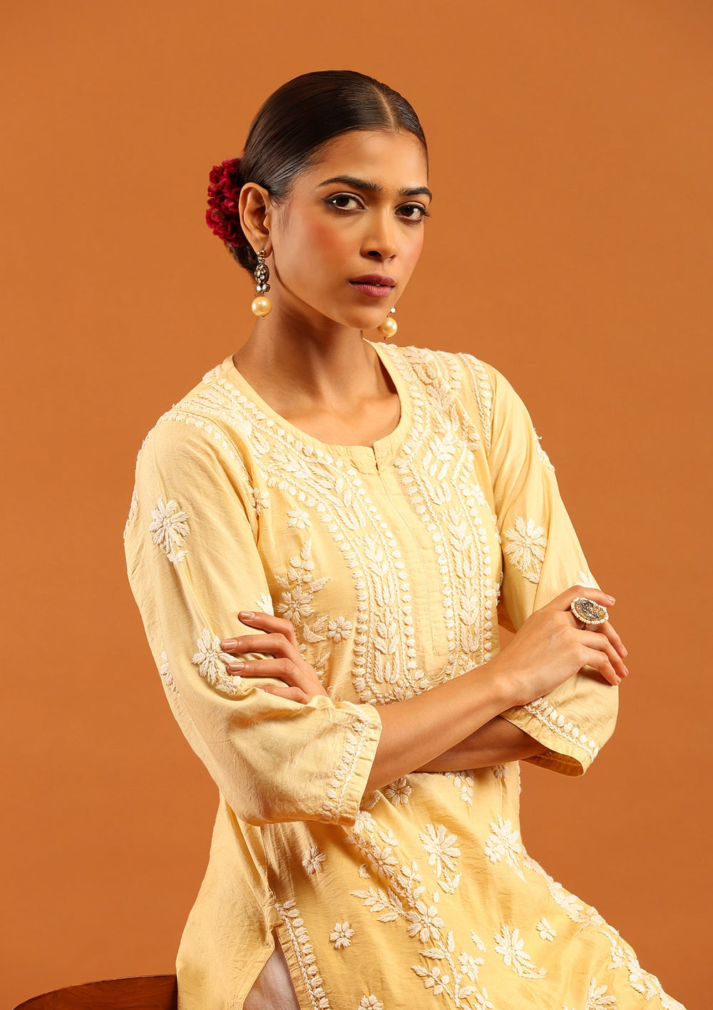 HOC Chanderi Chikankari Solid Women's Long Kurta -Mustard