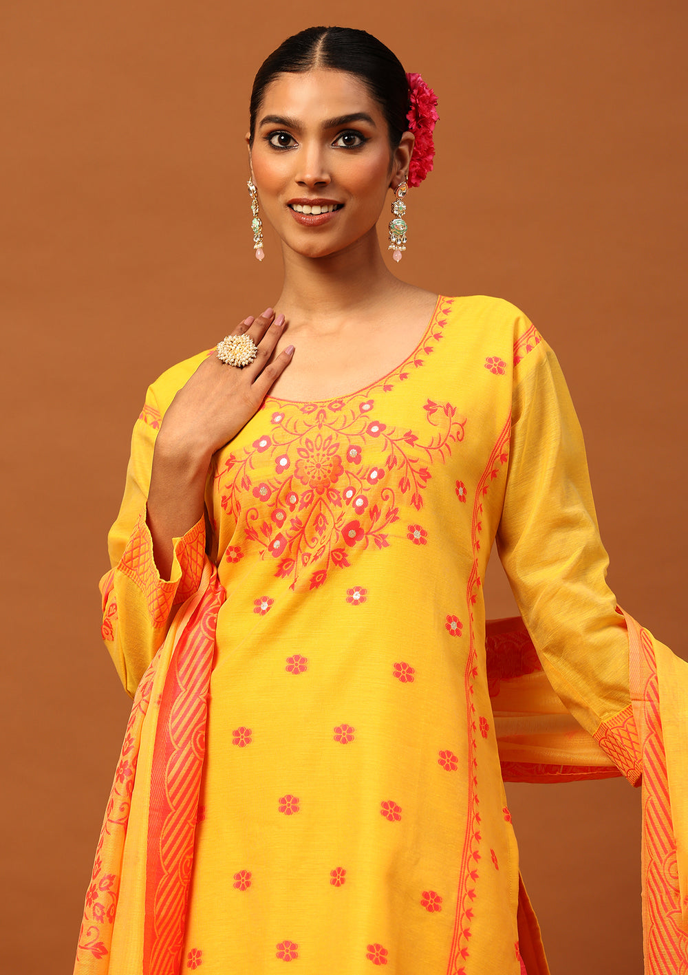 HOC Banarasi Chanderi Hand Weave Women's 3PC Long Kurta Set -Mustard
