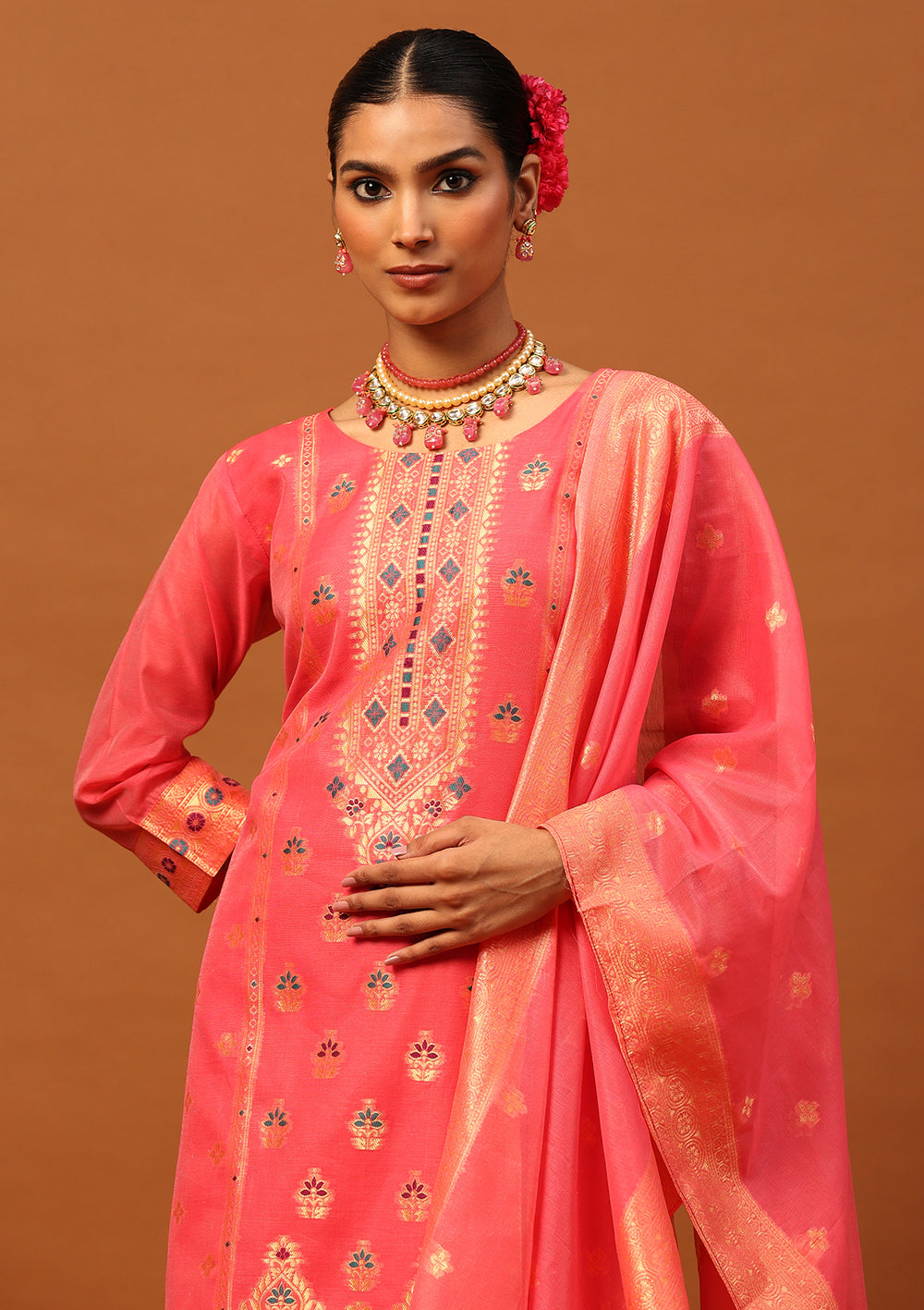 HOC Banarasi Chanderi Hand Weave Women's 3PC Long Kurta Set -Pink
