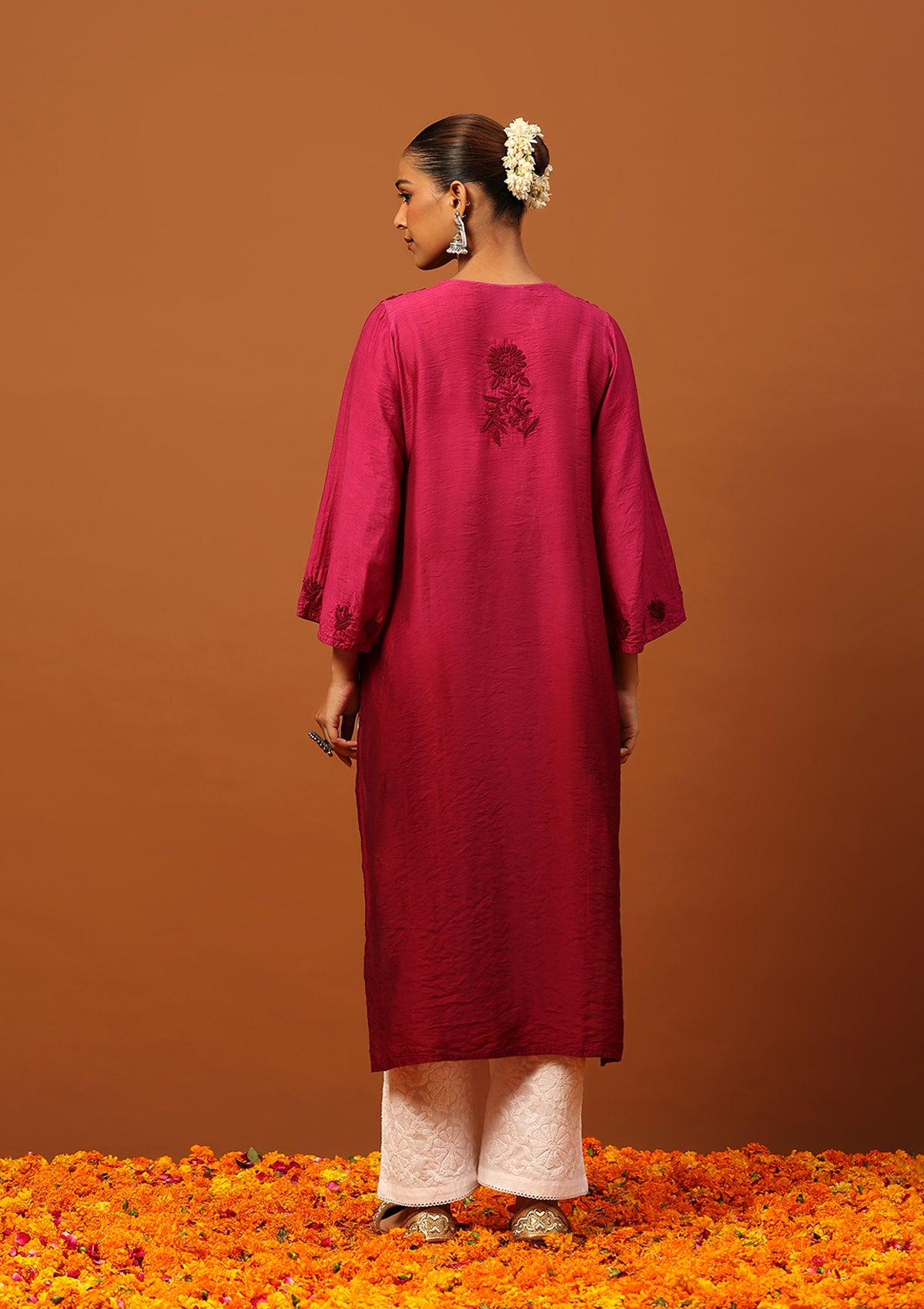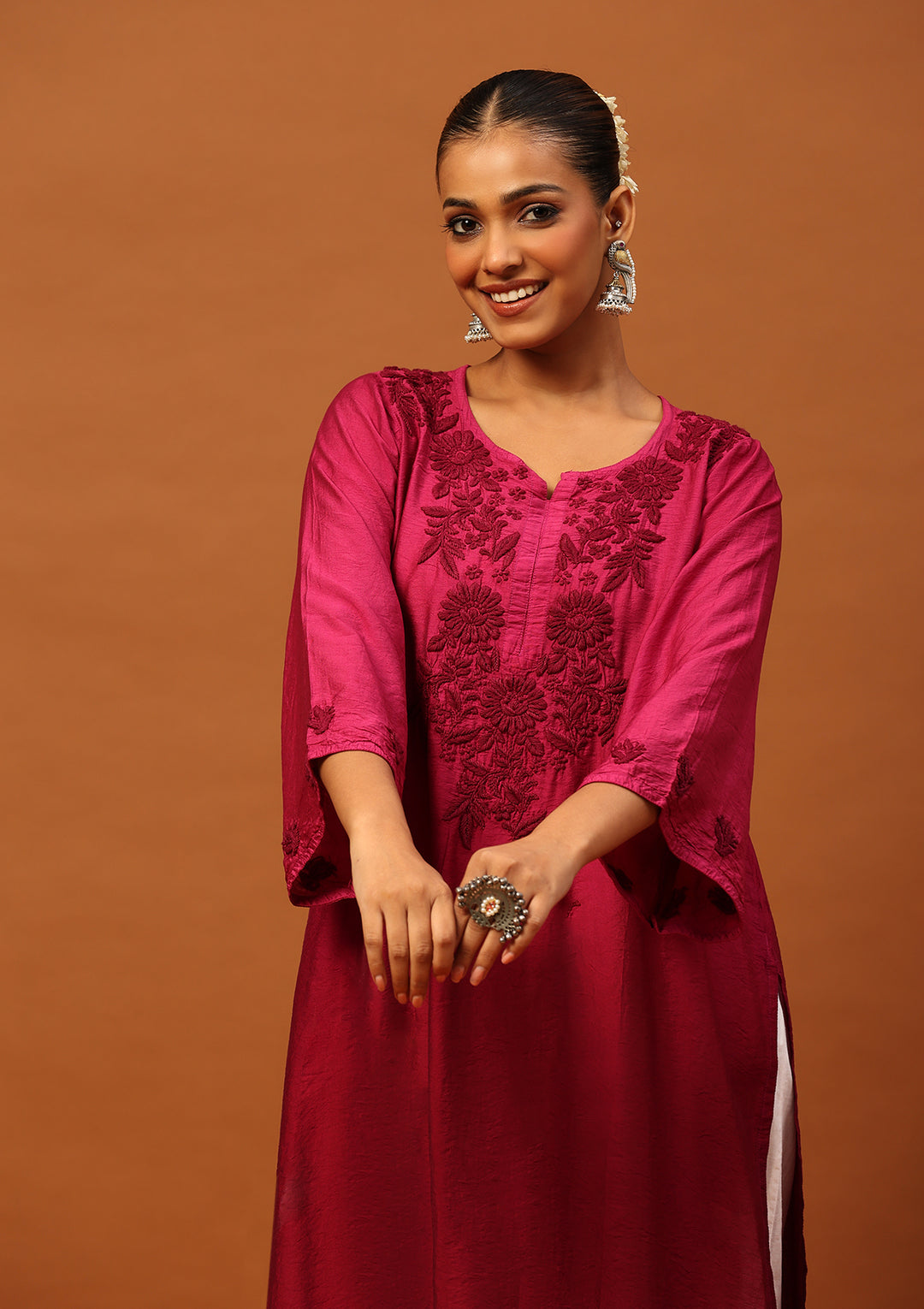 HOC Chanderi Chikankari Ombre Women's Long Kurta -Wine