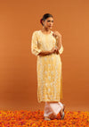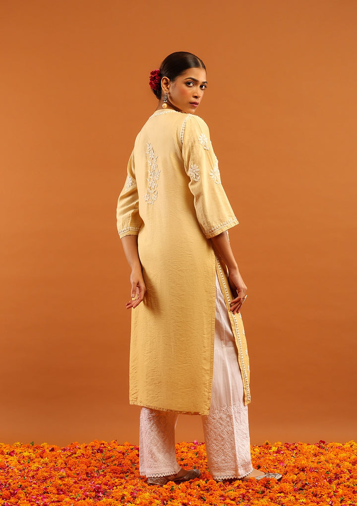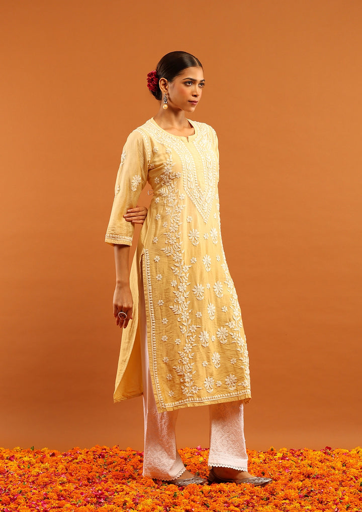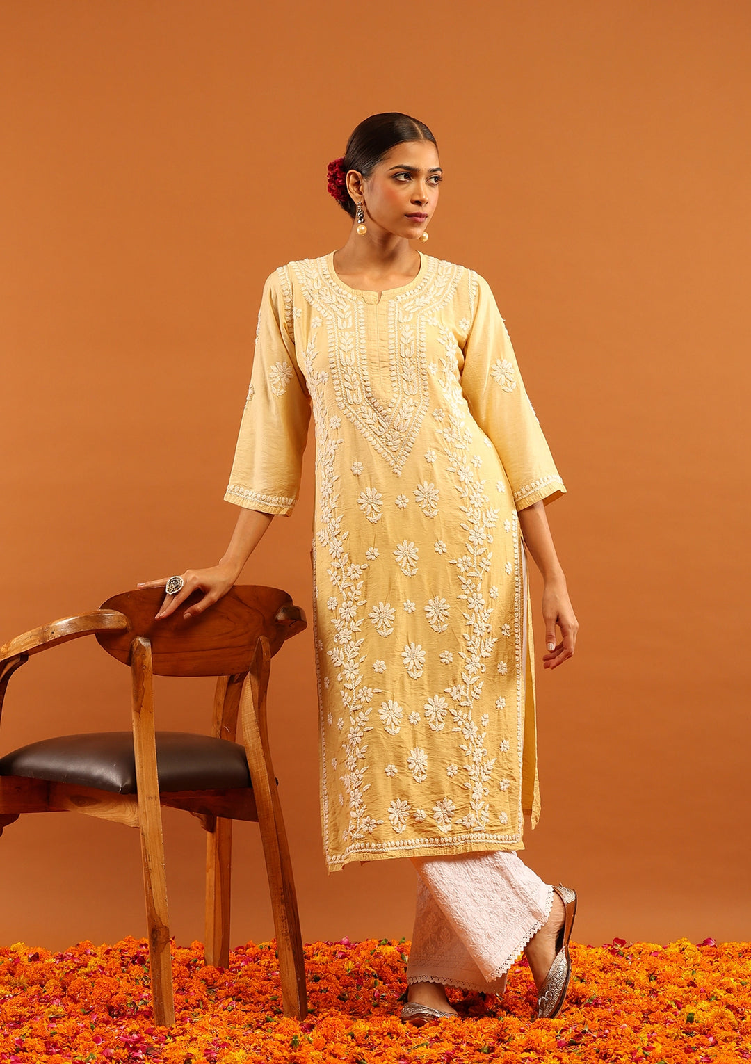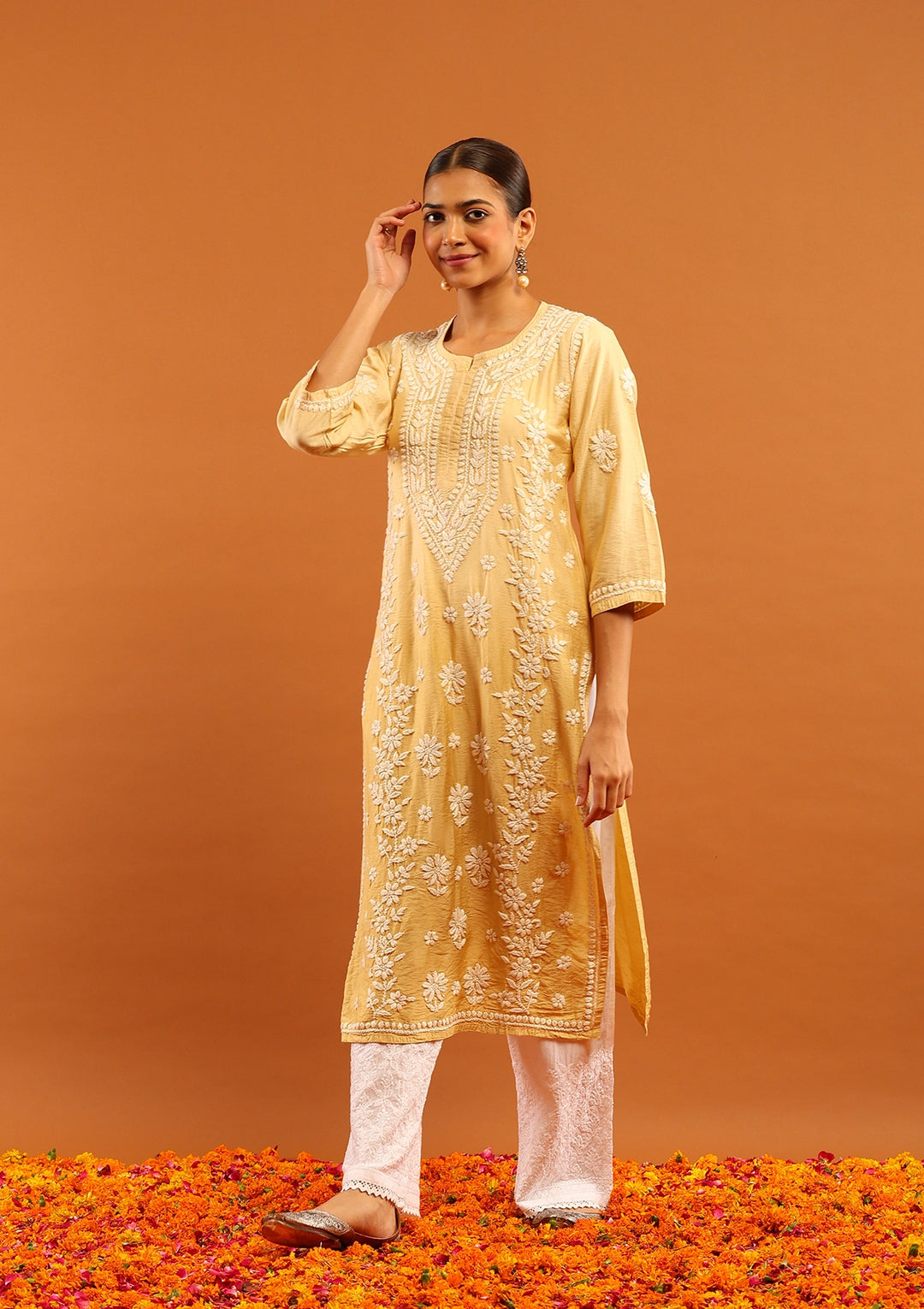 HOC Chanderi Chikankari Solid Women's Long Kurta-Light Yellow