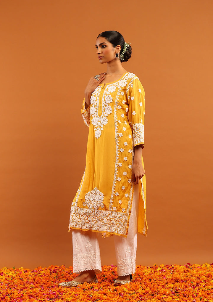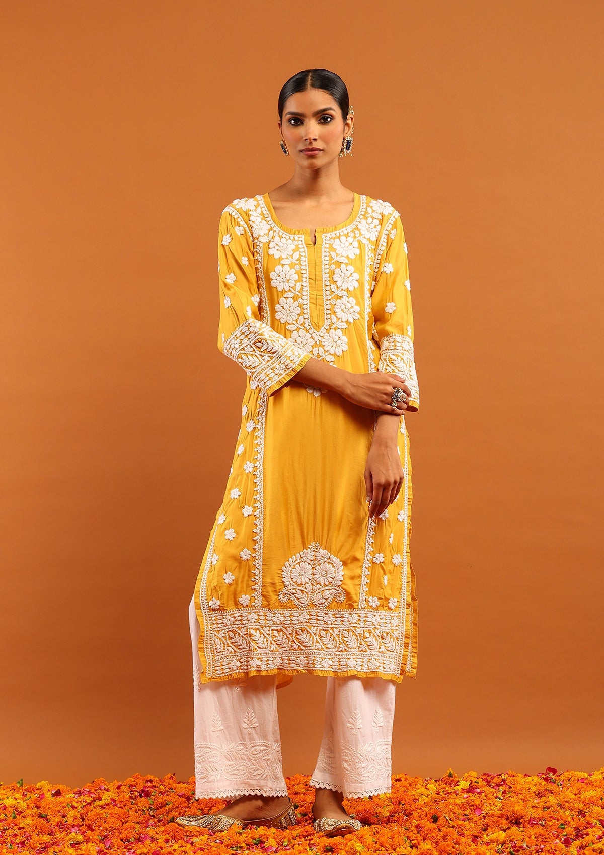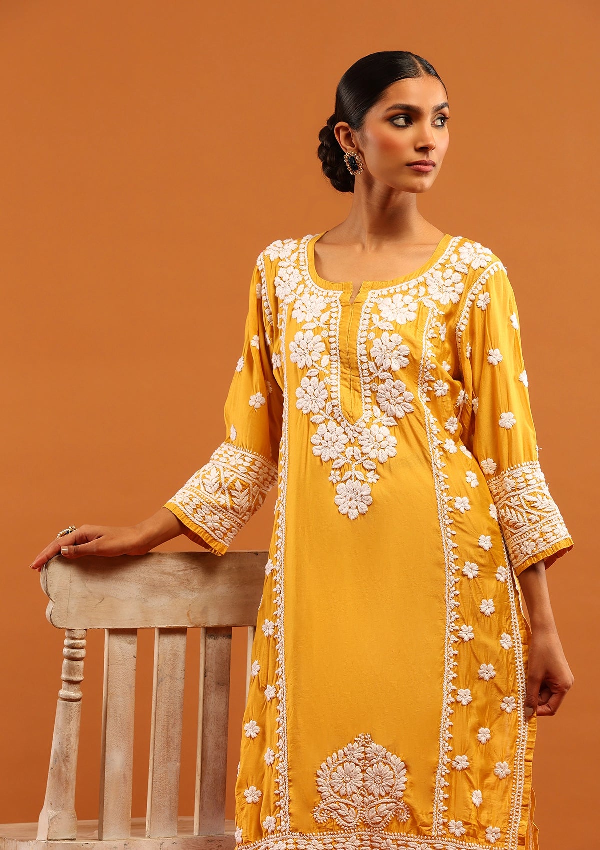HOC Chanderi Chikankari Solid Women's Long Kurta - Mustard