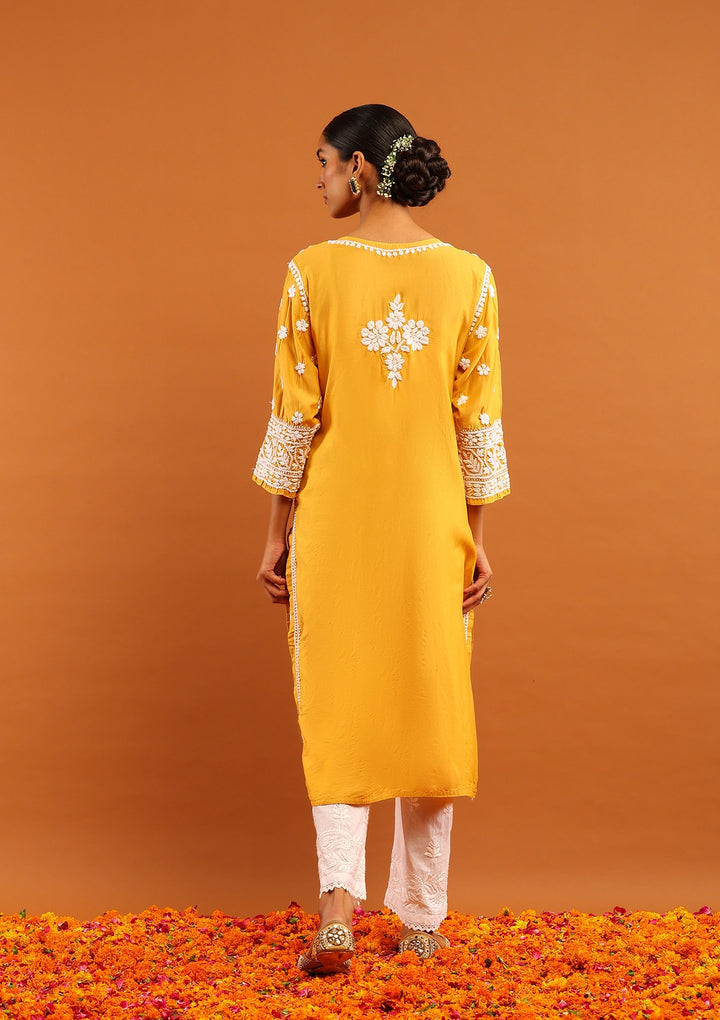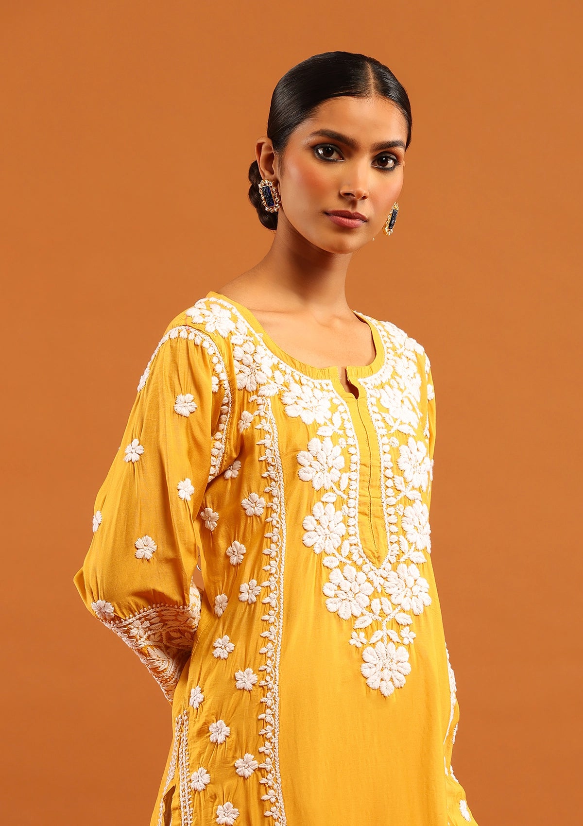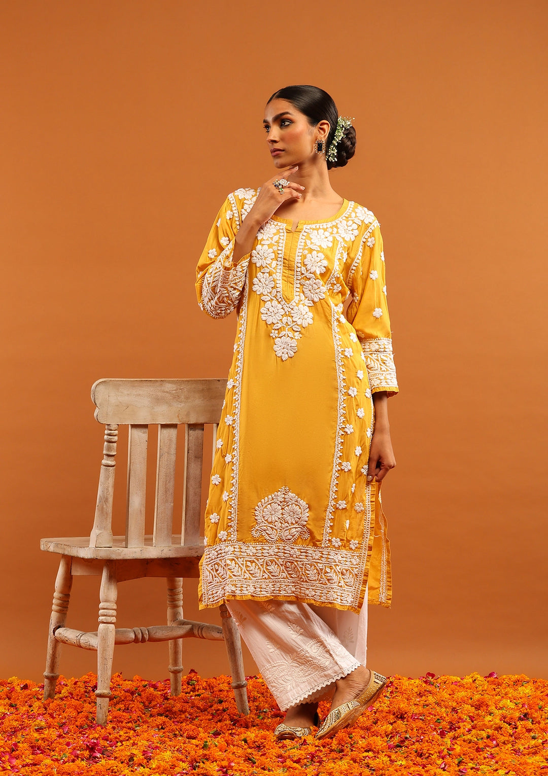 HOC Chanderi Chikankari Solid Women's Long Kurta - Mustard