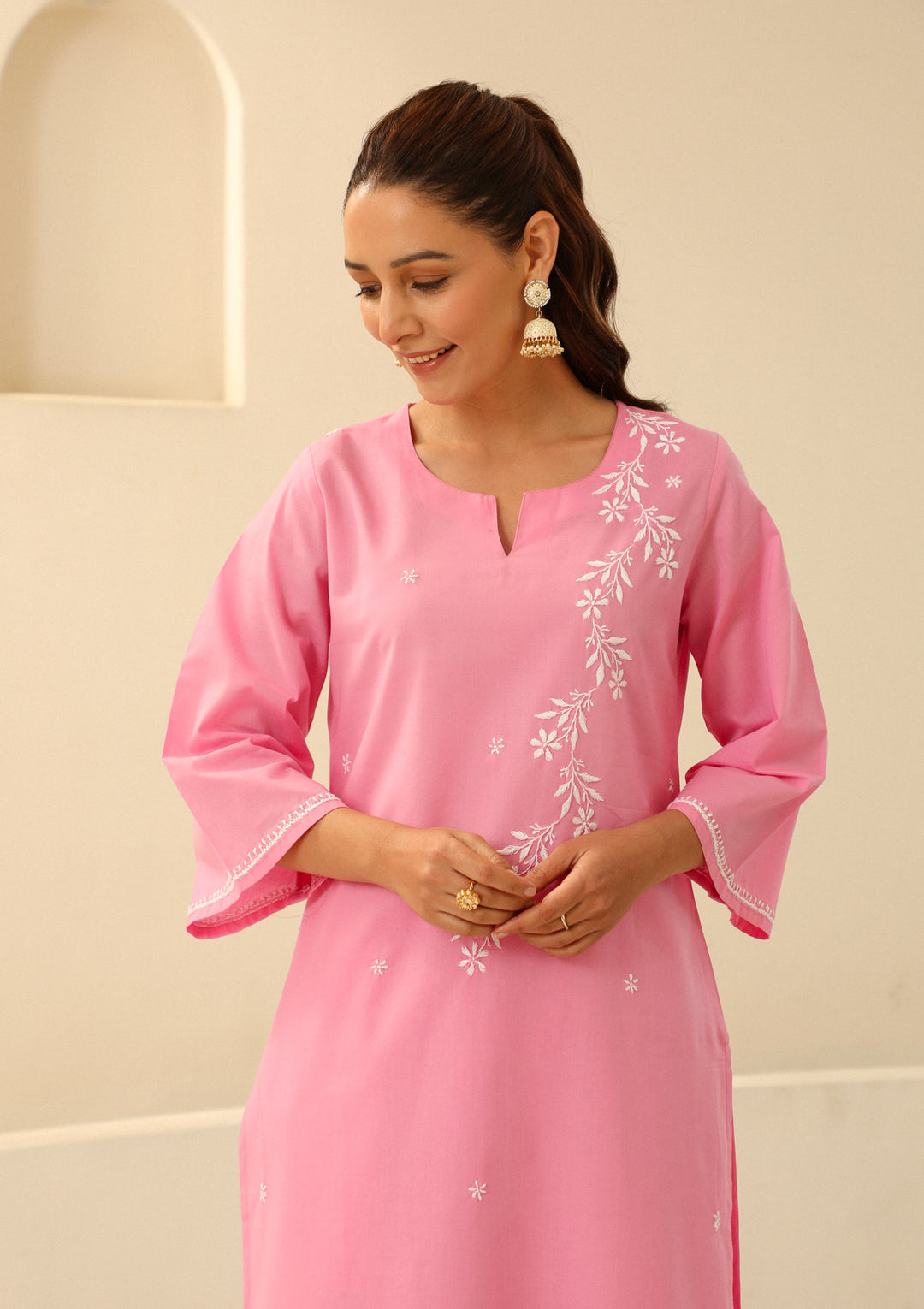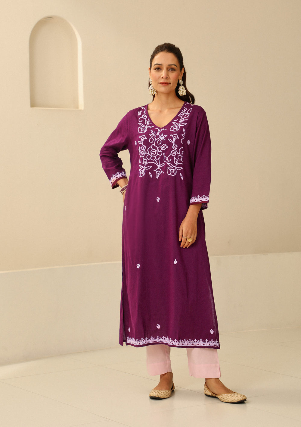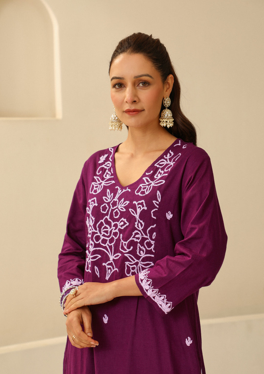 HOC Kashmiri Wool Aari Embroidered Solid Women's Short Kurta-Dark Pink