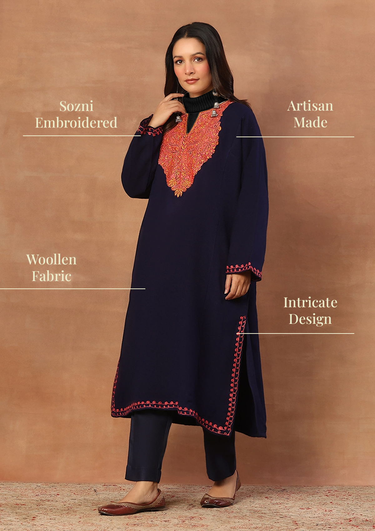 HOC Kashmiri Wool Sozni Solid Women's Long Phiran- Navy Blue