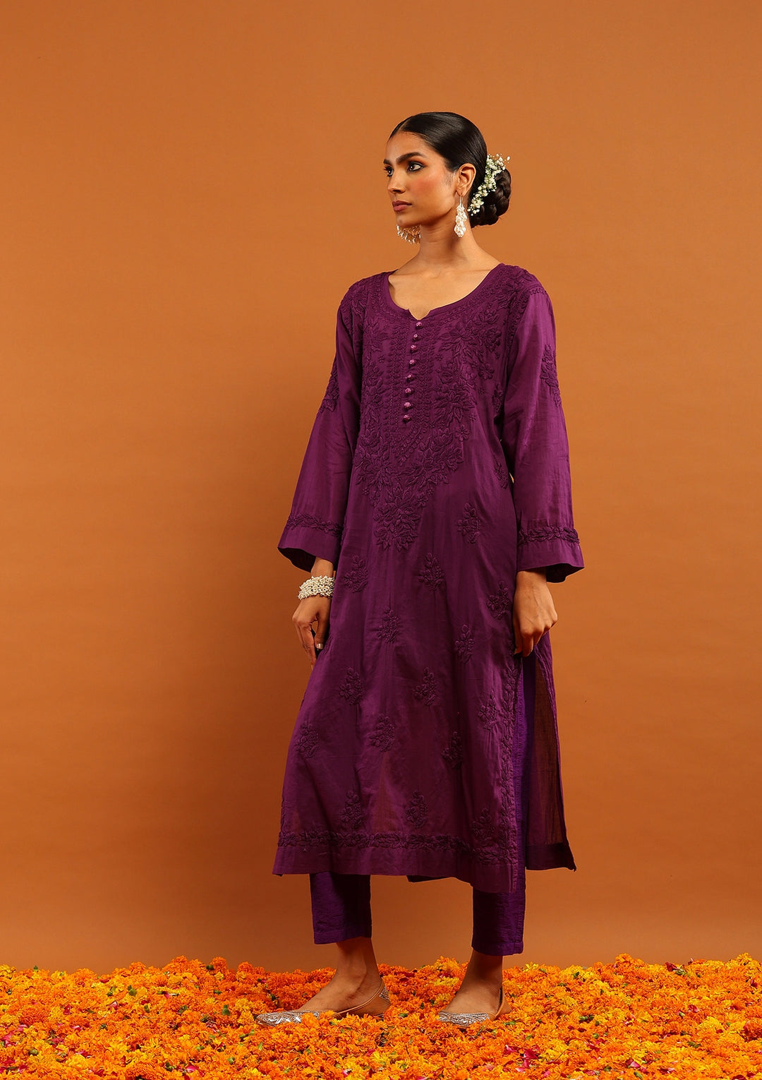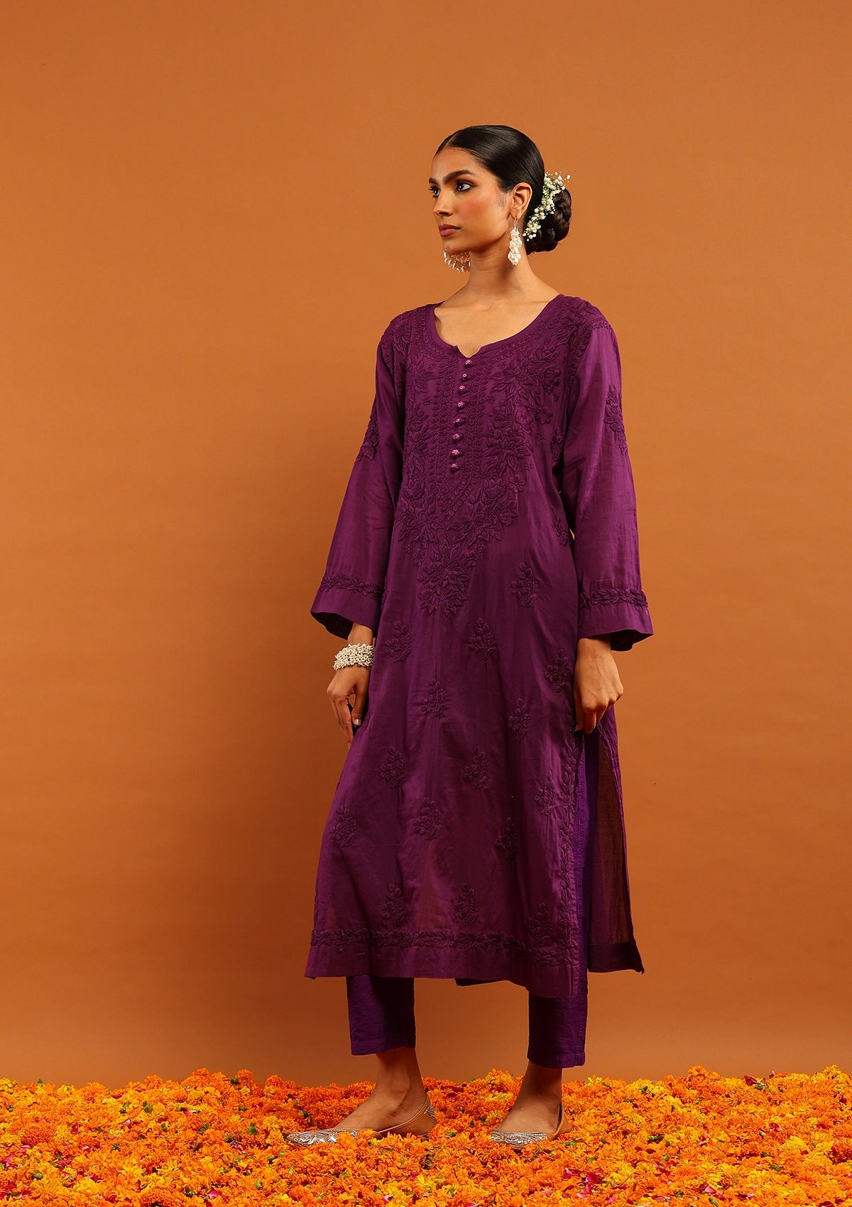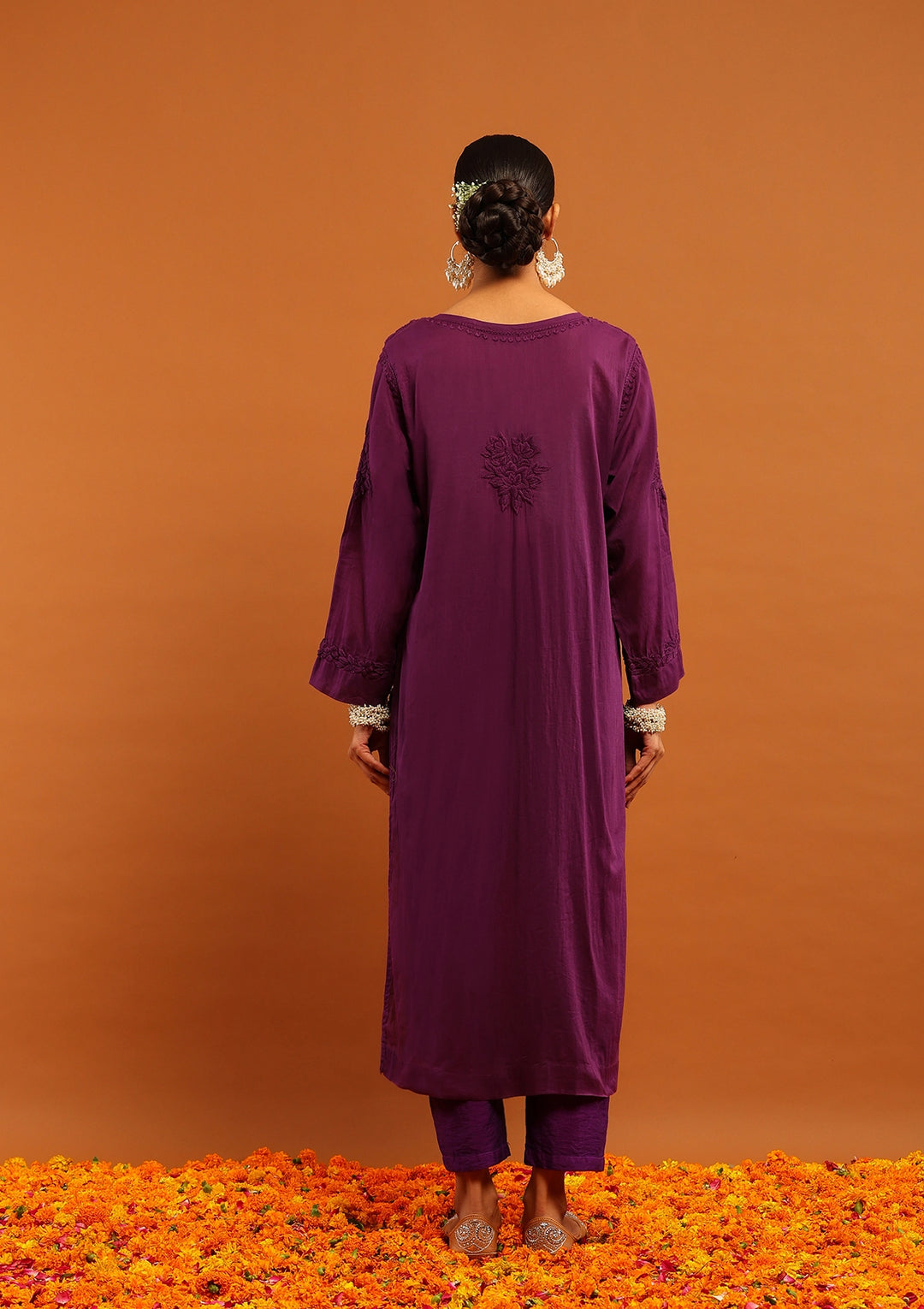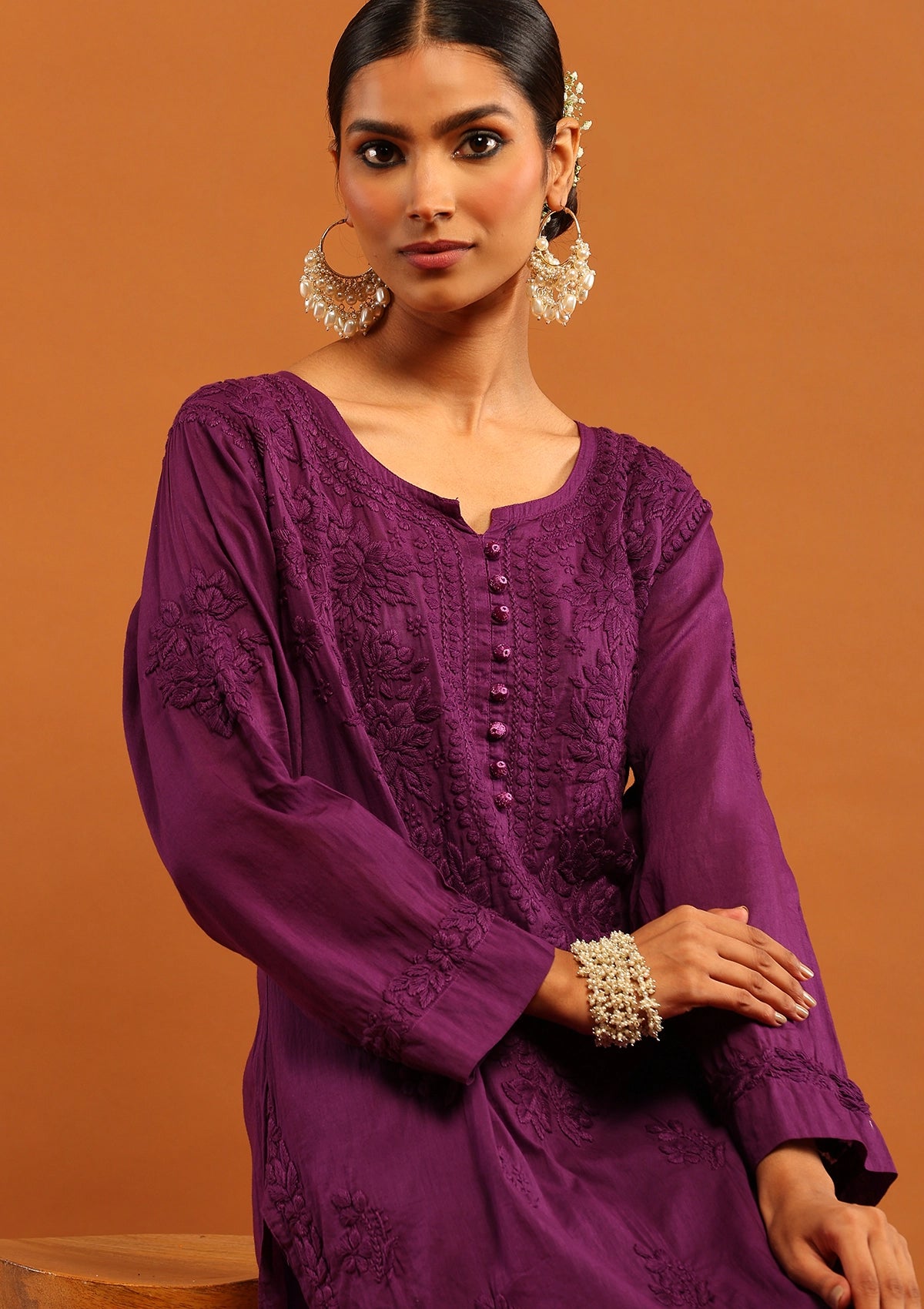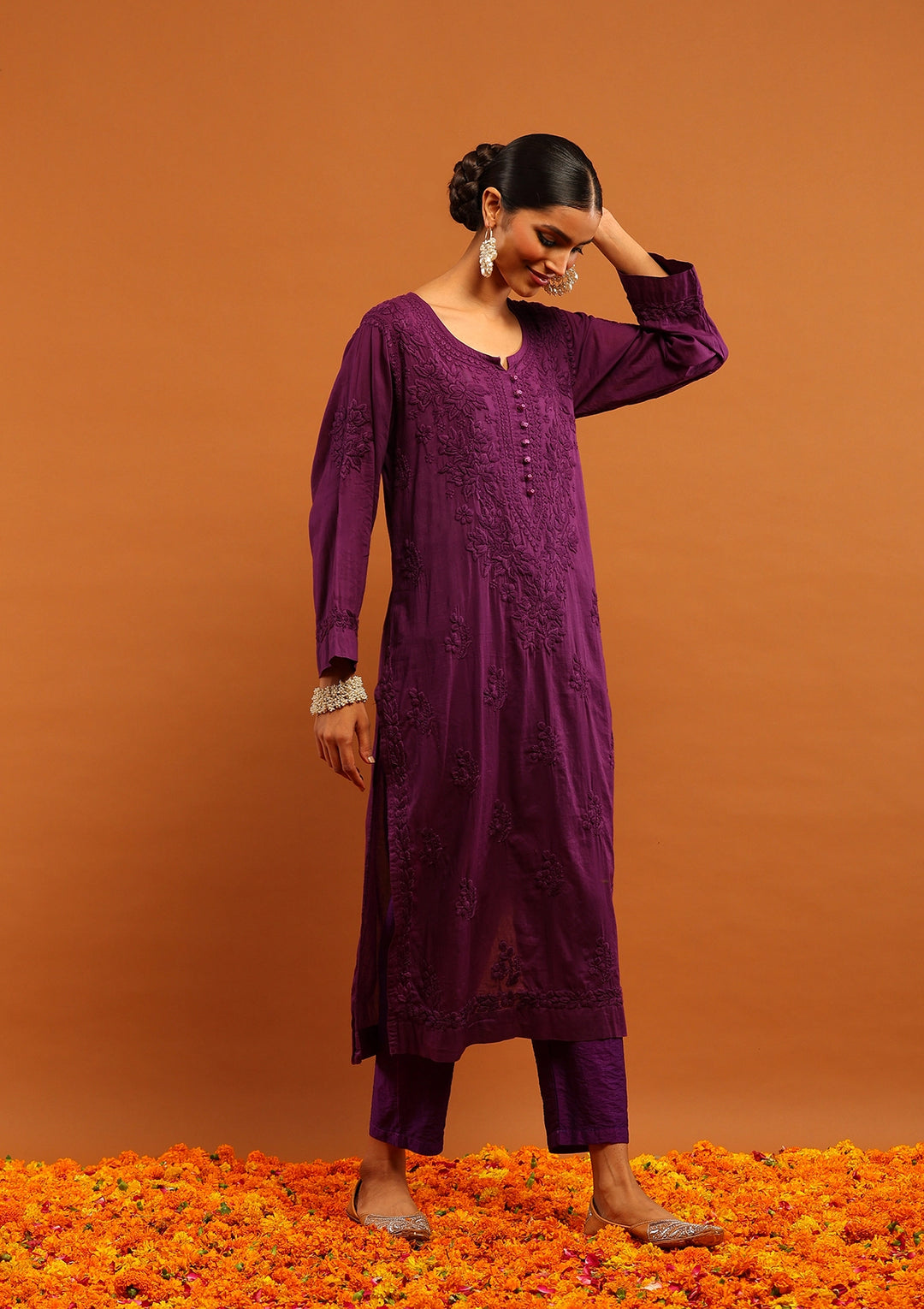 HOC Cotton Chikankari Solid Women's Long Kurta- Dark Purple