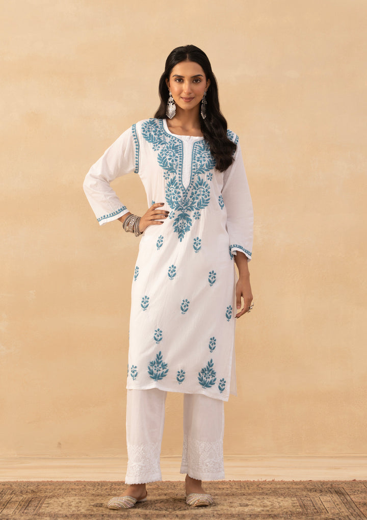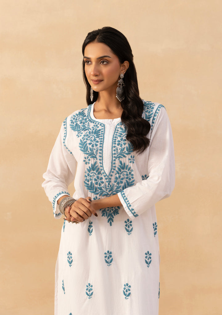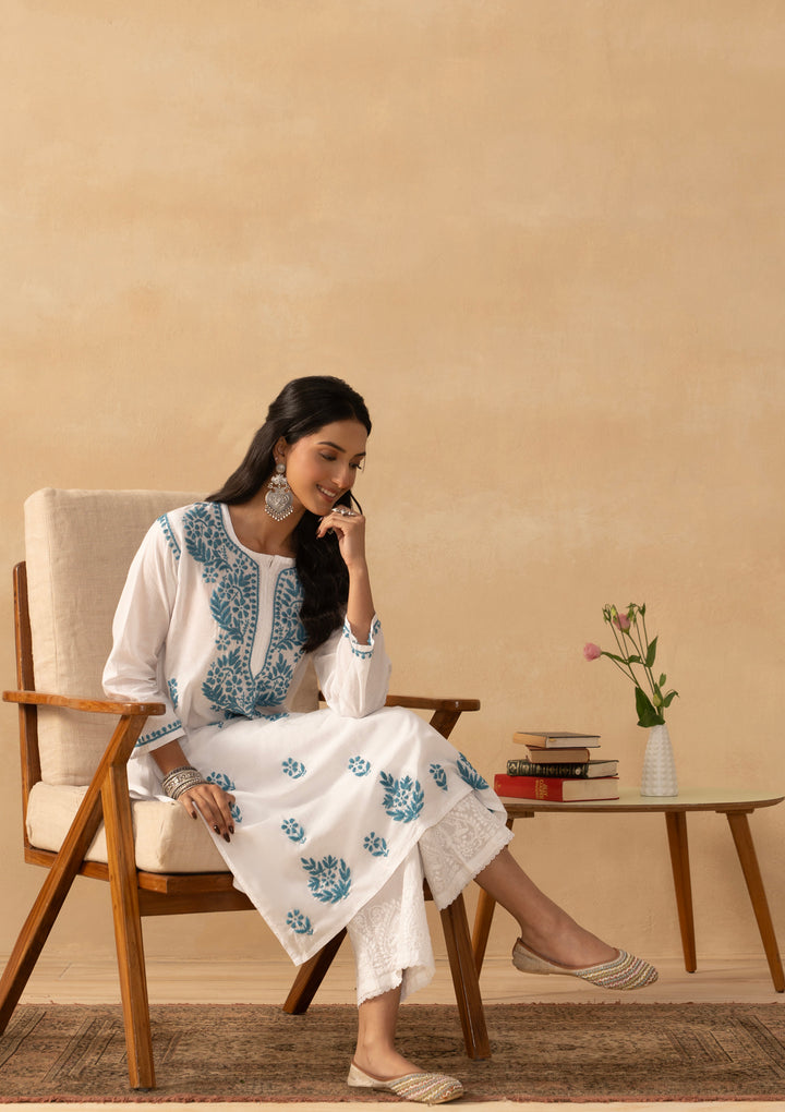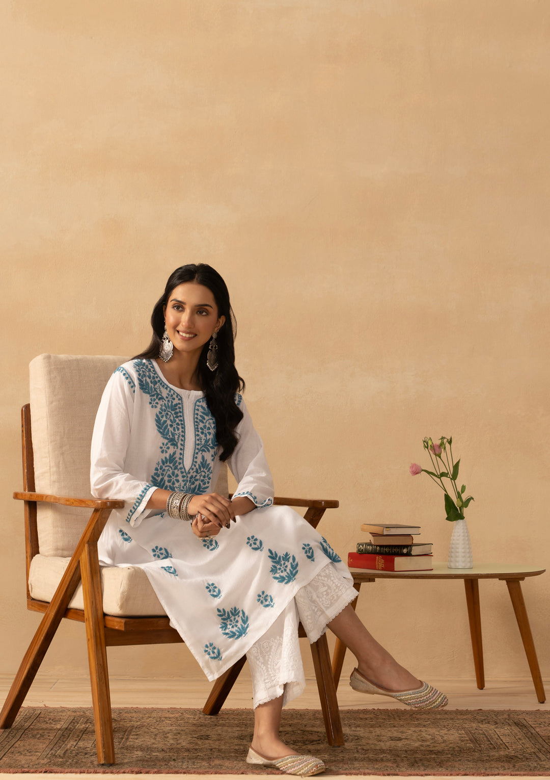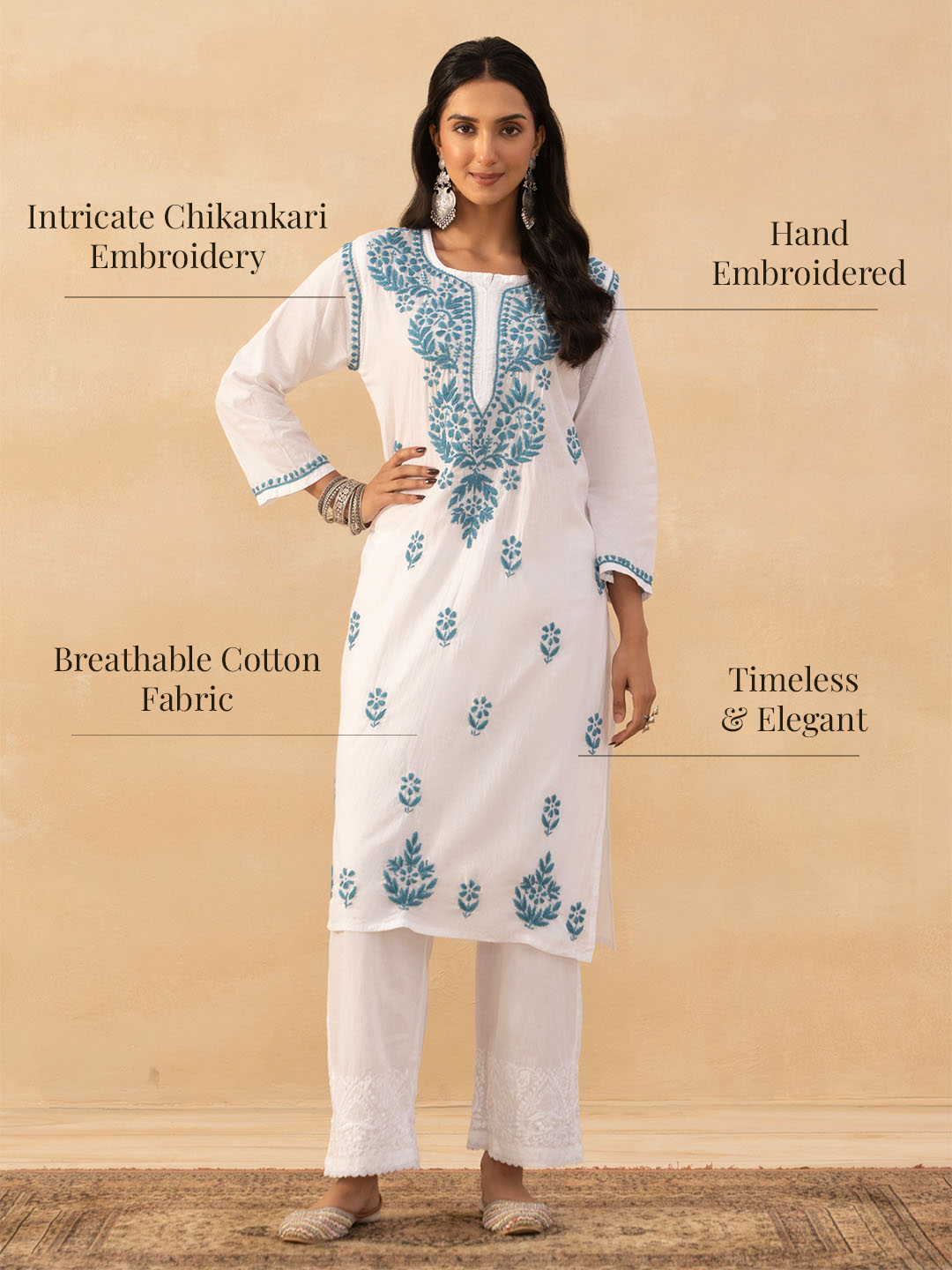HOC Cotton Chikankari Solid Women's Long Kurta -White