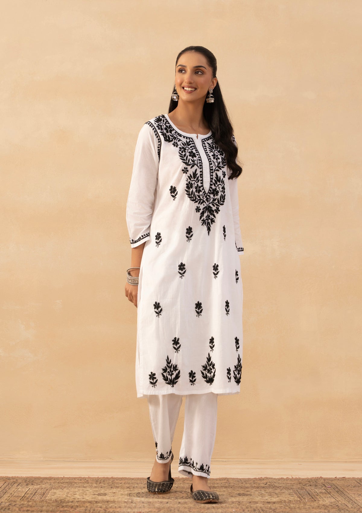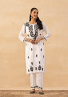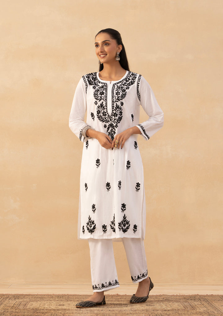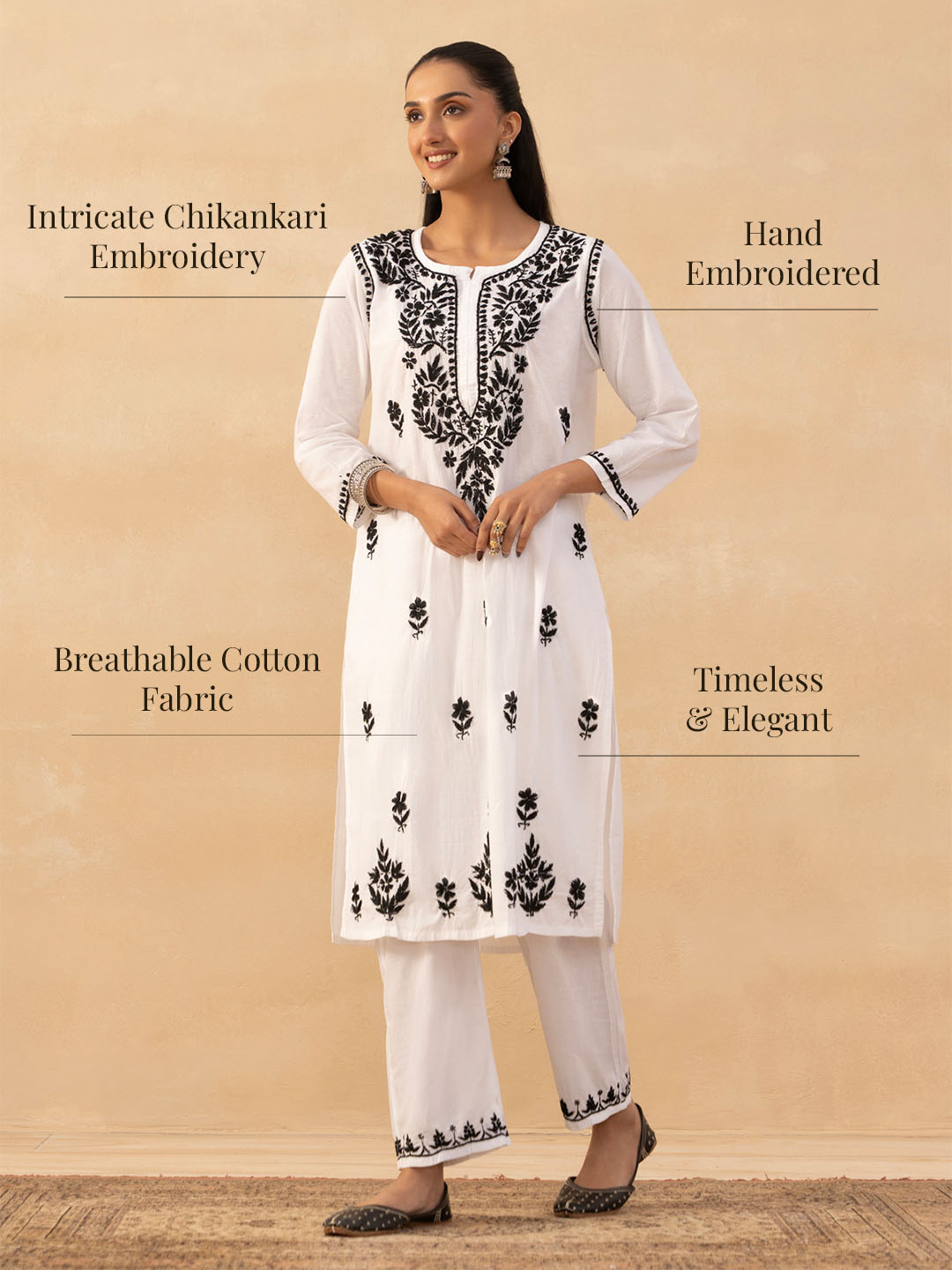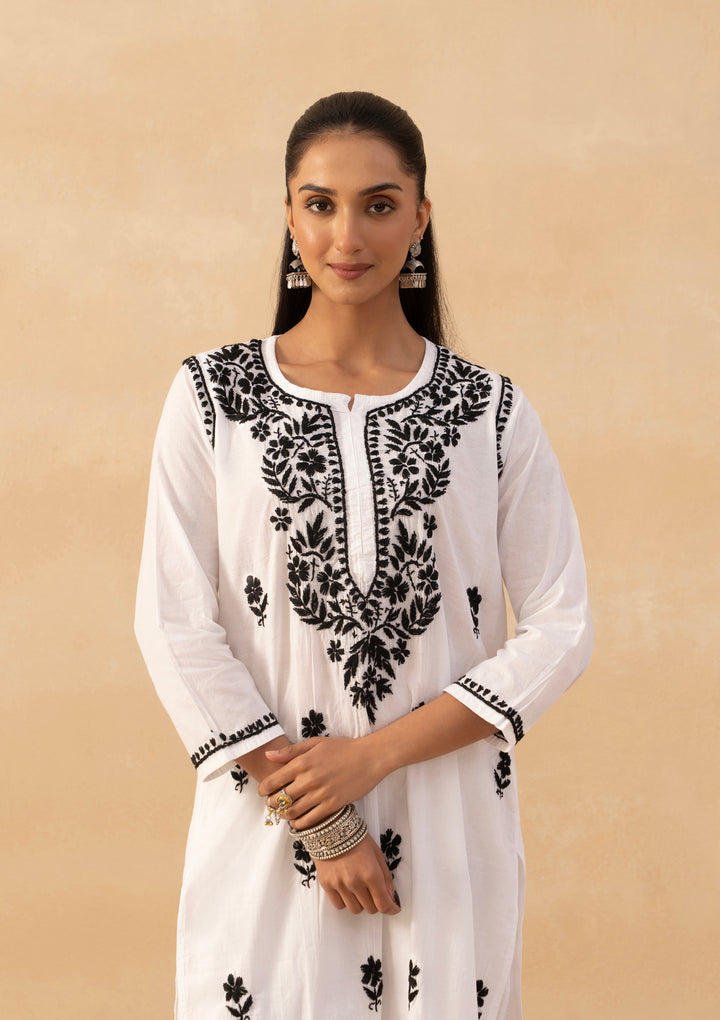 HOC Cotton Chikankari Solid Women's Long Kurta - White