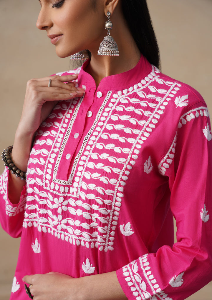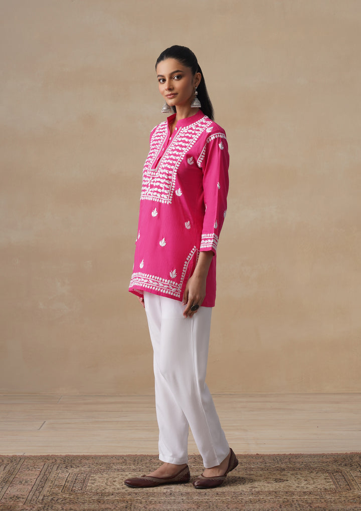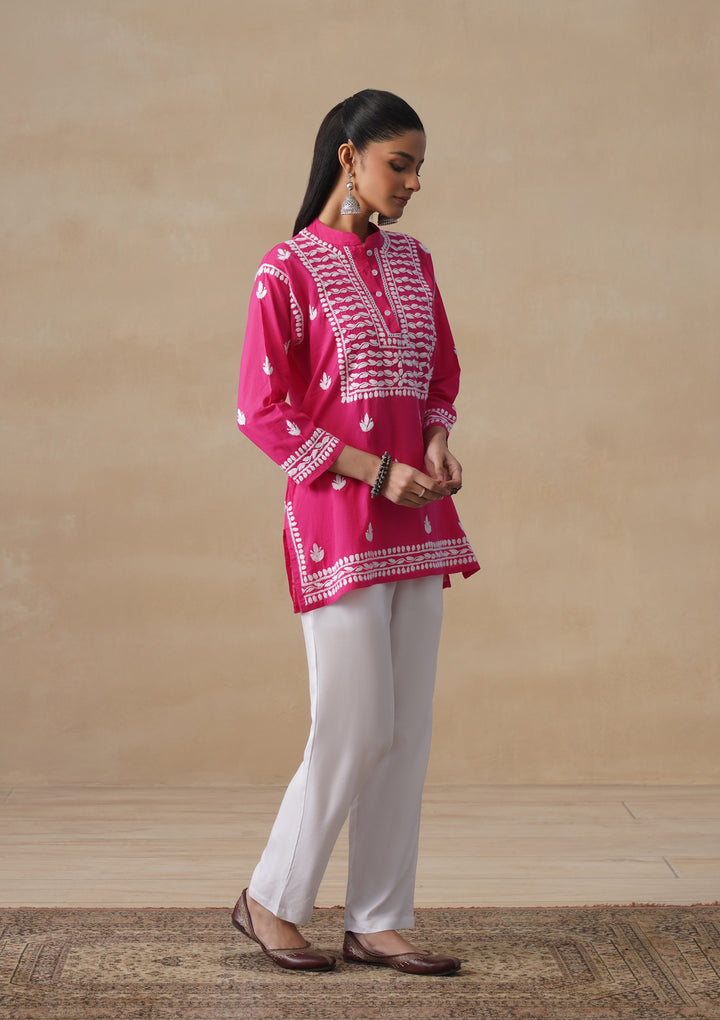 HOC Pure Cotton Chikankari Solid Women's Short Kurta-Fuschia