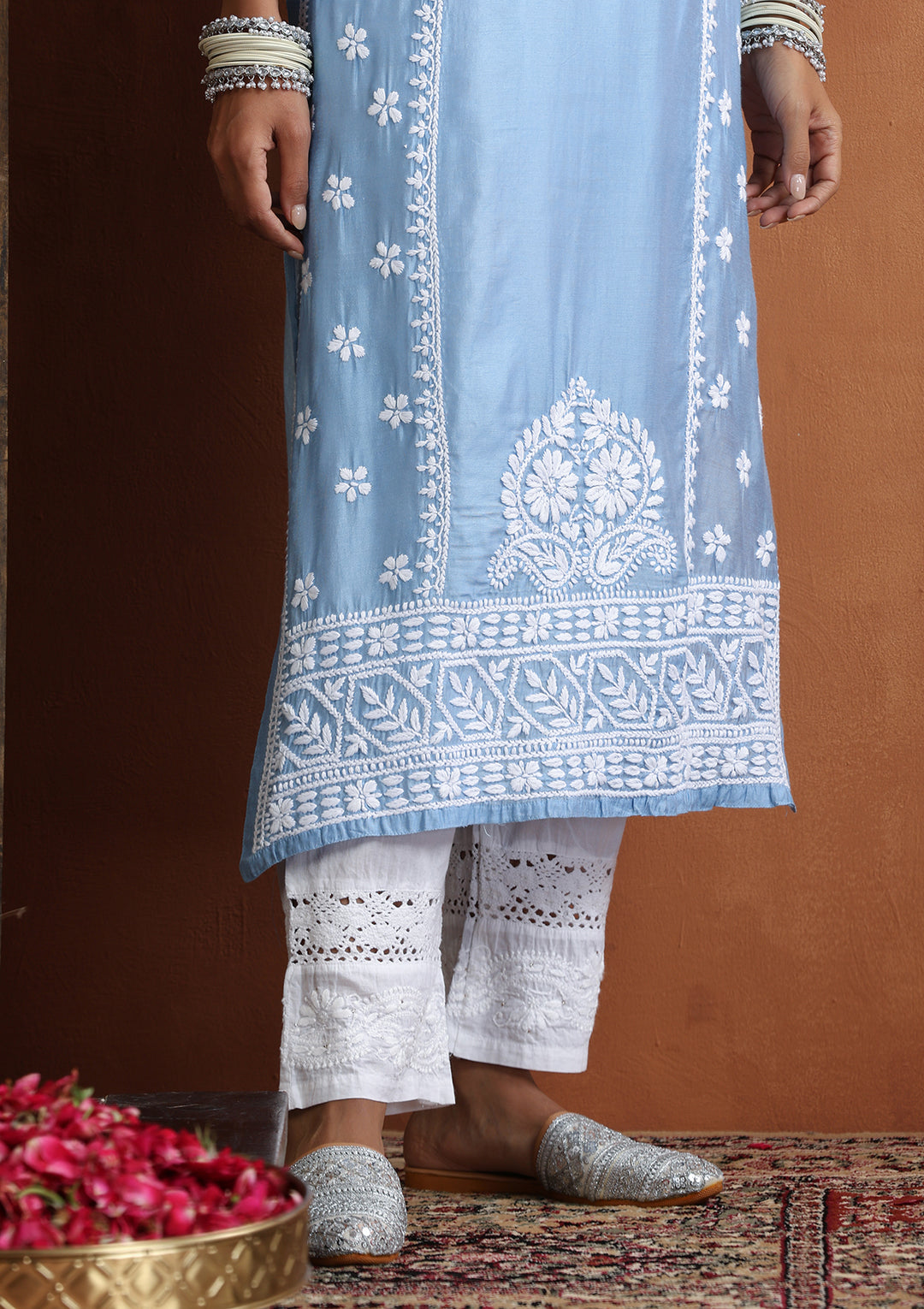 HOC Chanderi Chikankari Solid Women's Long Kurta - Blue