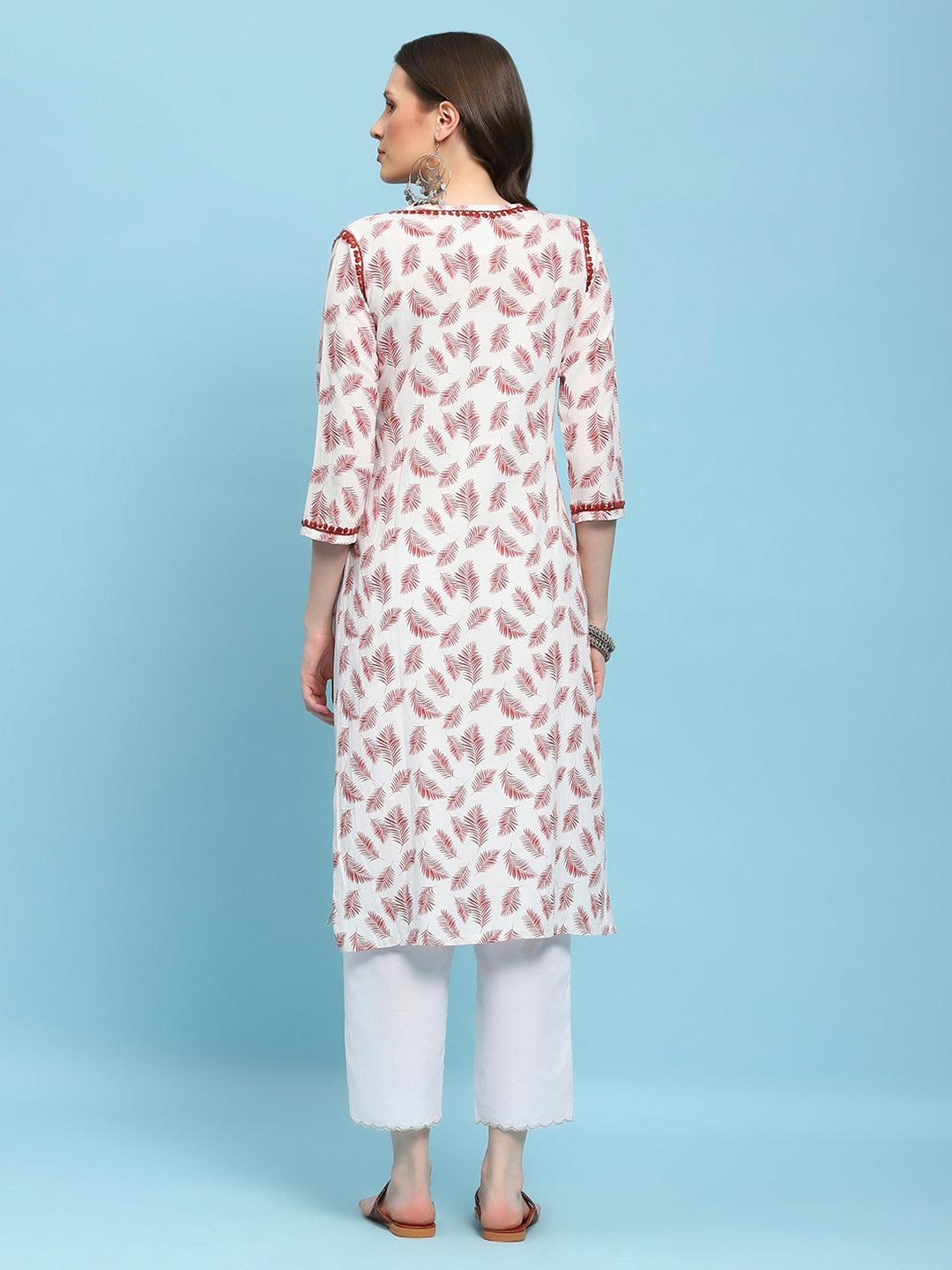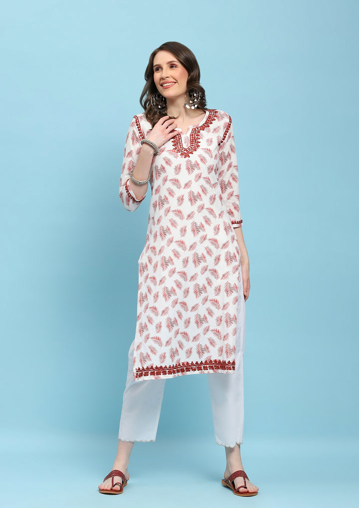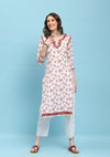 HOC Linen Blend Chikankari Printed Women's Long Kurta - White