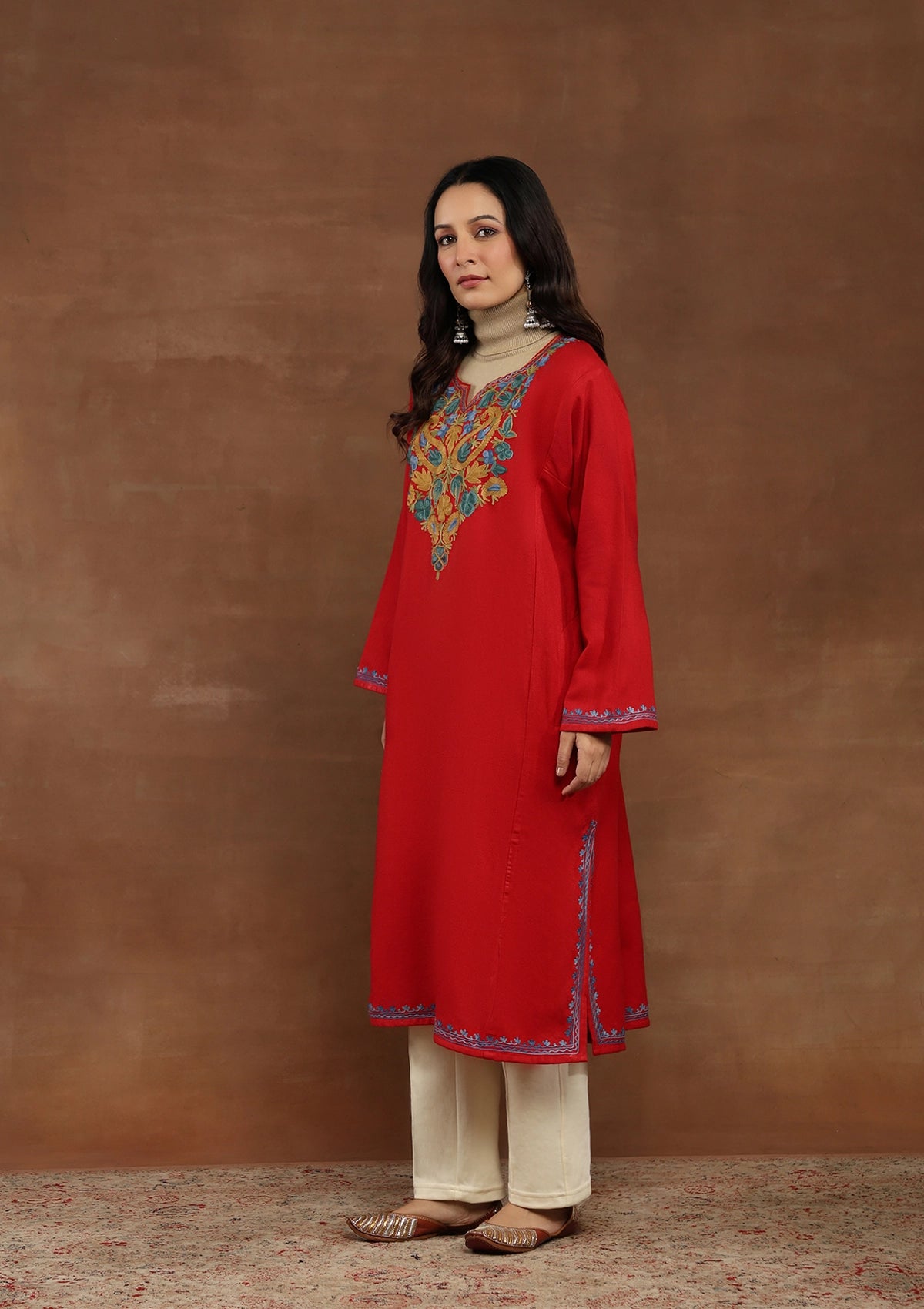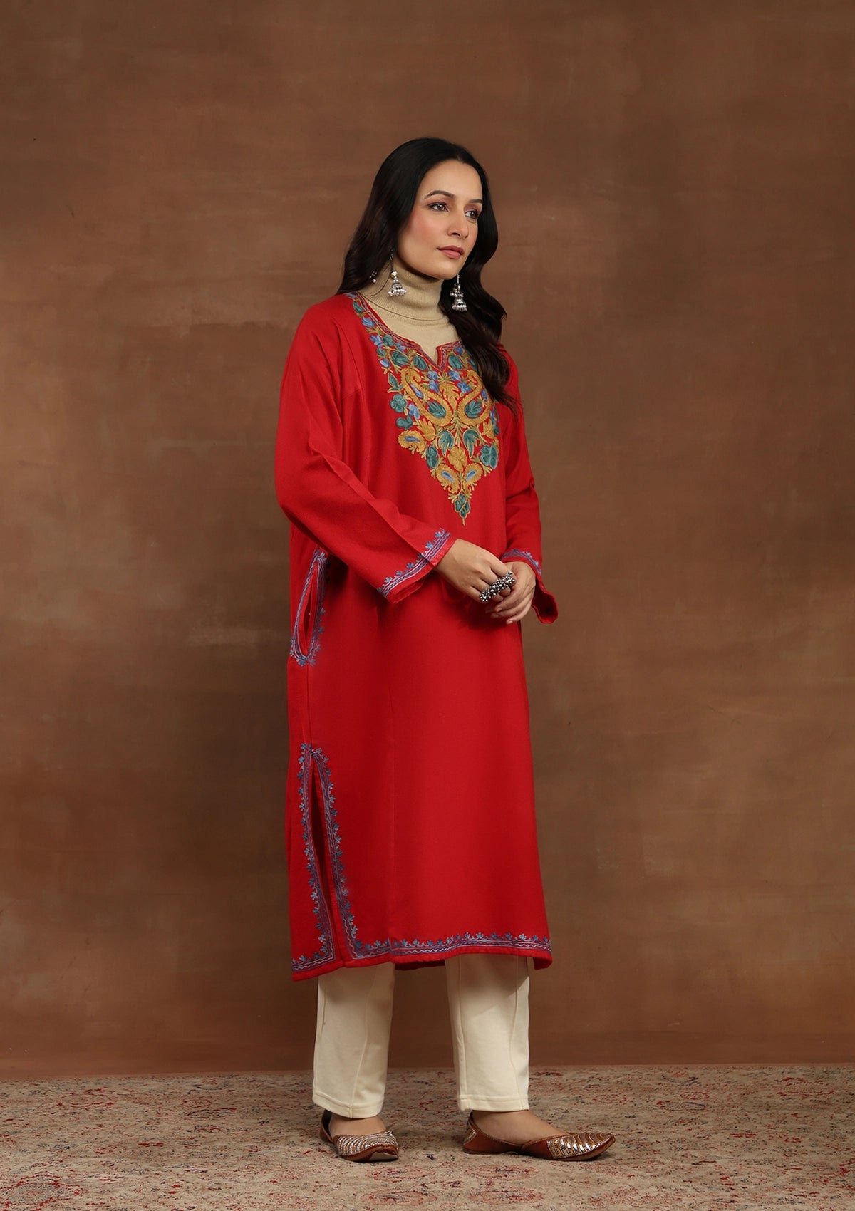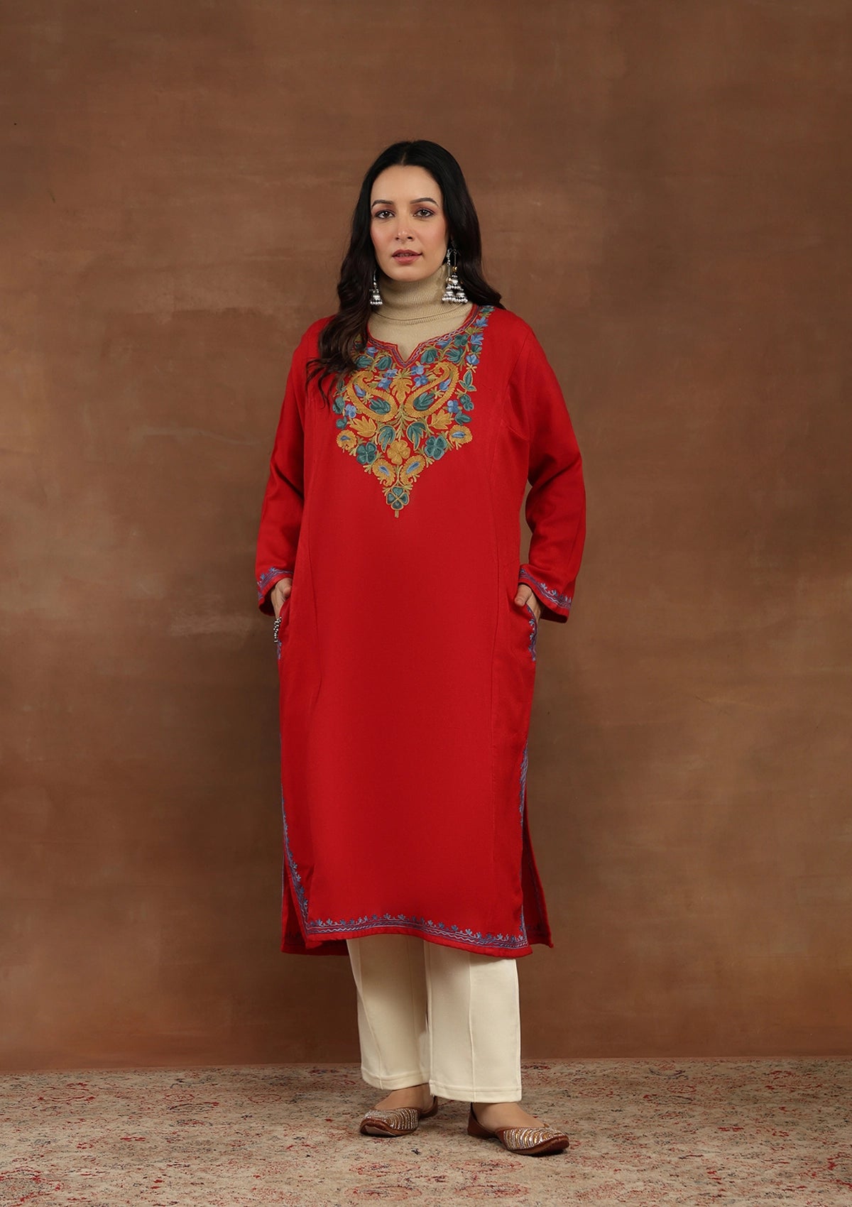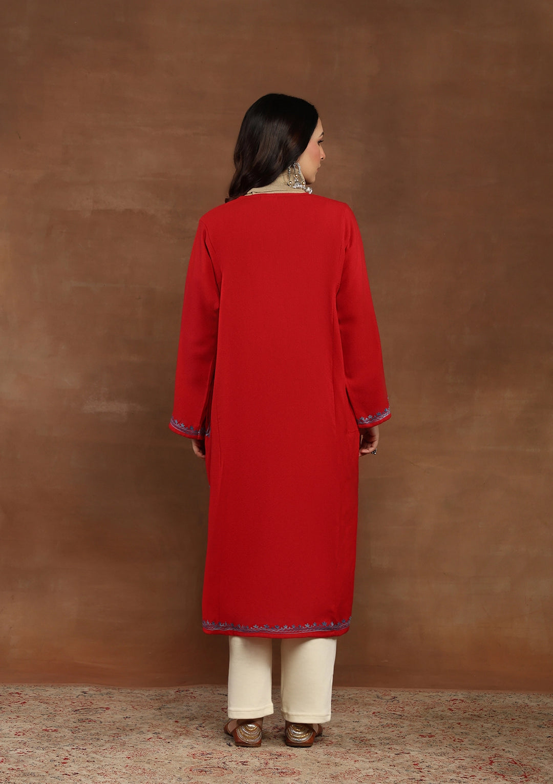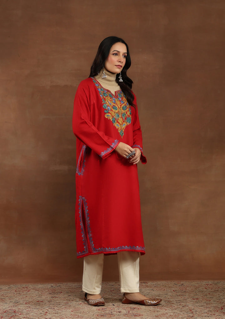 HOC Kashmiri Wool Aari Embroidered Solid Women's Phiran-Red