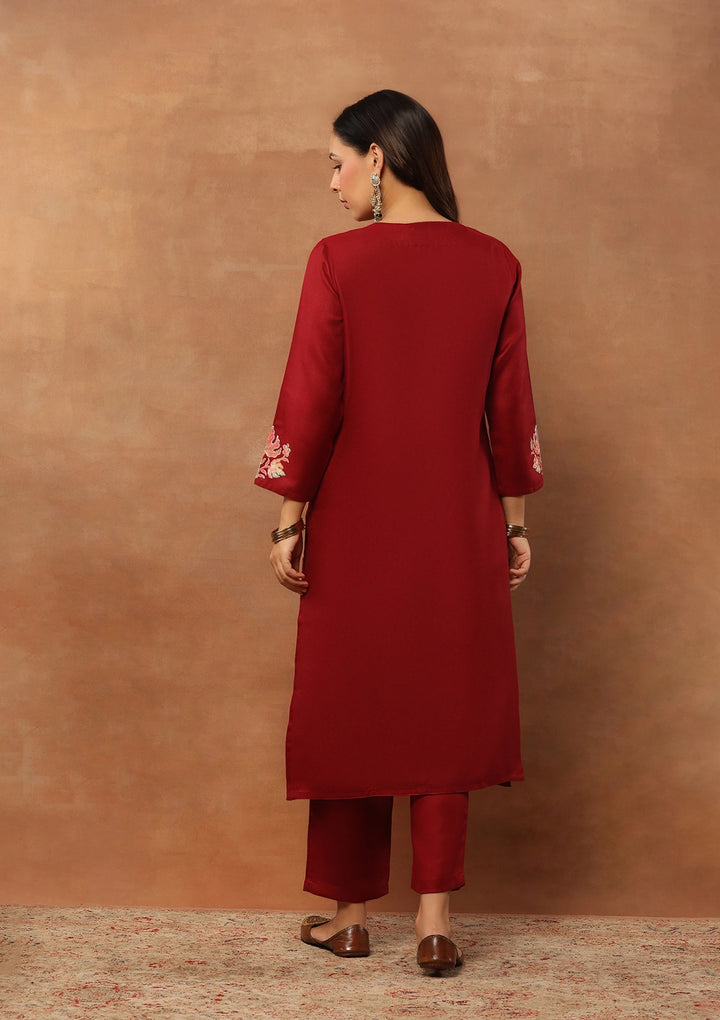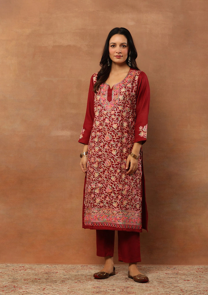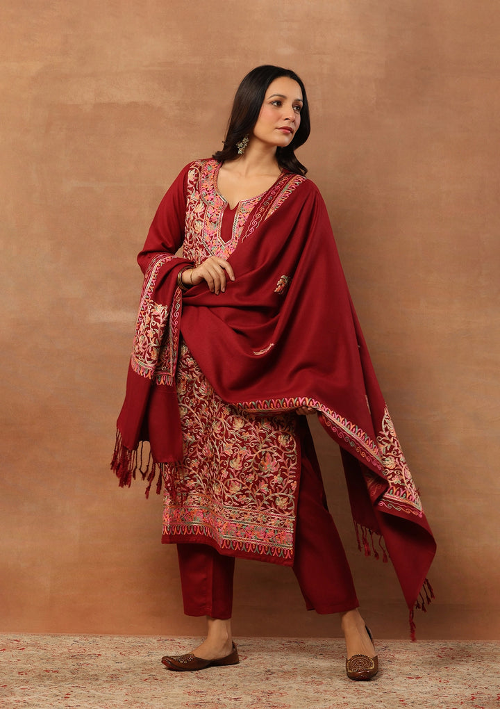 HOC Aari Woollen Straight Kurta Set with Dupatta-Maroon